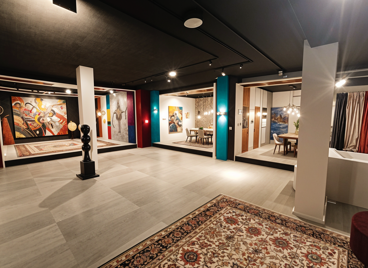 richard rogers wide angle shot artistique wide angle shot furniture and home accessories showroom colorful and artist design many small partitions each partition for only 1 supplier rugs partition artwork partition lighting partition furniture partition wall textures home accessories partition fabrics curtaines add artistique partitions to separate every supplier black ceiling grey floor no windows architecture