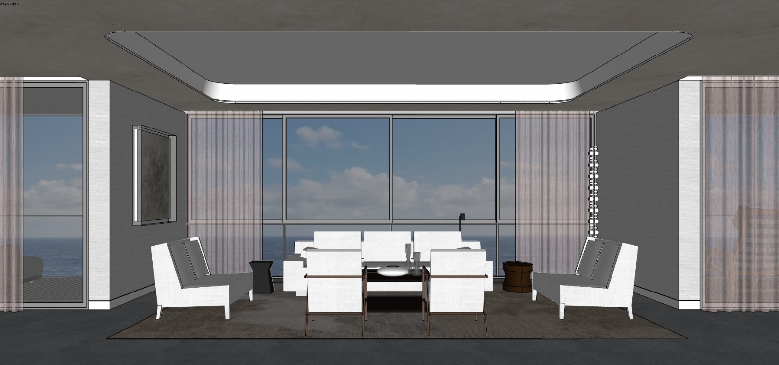 maintain the exact original architectural layout room proportions ceiling height structural grid window sizes door positions and overall spatial configuration exactly as modeled do not alter geometry wall placements ceiling planes or opening dimensions transform only the interior finishes furniture styling material palette lighting and decorative elements to match the reference aesthetic overall design intent create a refined modern minimalist living room with gallery like spatial clarity strong horizontal lines neutral monochromatic palette sculptural statement art piece large format glazing emphasis high end contemporary residential character the space should feel calm architectural monumental understated luxury art focused walls ceiling treatment smooth matte off white walls warm white not yellow clean sharp corner detailing minimal shadow gaps where appropriate white ceiling with subtle beam detailing if compatible with geometry no decorative moldings no ornamentation walls must feel gallery like and calm flooring large format light beige limestone or travertine tile matte or lightly honed finish minimal grout lines subtle natural stone variation seamless appearance warm but neutral tone floor should enhance spatial continuity windows glazing floor to ceiling glazing appearance without changing structure slim black metal window frames clear realistic glass transparency accurate exterior cityscape reflection visible depth beyond glazing exterior view should feel expansive and elevated furniture styling minimal low profile modern pieces long white or light beige upholstered sofas with clean lines deep seat cushions with minimal seams black square side tables matte finish low rectangular coffee table in light stone or neutral finish two matching white armchairs with sculptural softness minimal decorative objects books single tray subtle accessories furniture layout must feel balanced and symmetrical sculptural statement piece introduce one large black sculptural artwork abstract organic form high gloss or polished black finish positioned prominently as focal point museum quality presence it should feel like a curated gallery piece lighting set scene at early evening or overcast daylight lighting requirements soft diffused natural light from large glazing subtle ambient ceiling lighting hidden sources no visible spotlights no dramatic shadows balanced exposure soft interior glow if dusk setting no heavy color grading lighting must feel natural and architectural color palette white warm off white beige stone black accents soft grey cushions no bright colors no decorative clutter material realism ultra photorealistic rendering realistic fabric texture accurate stone veining scale natural shadow softness correct glass reflection and refraction balanced global illumination no hdr exaggeration no artificial bloom camera direction 35mm architectural lens eye level perspective centered composition strong horizontal alignment wide framing to capture glazing and art piece clean verticals no distortion overall goal create a high end modern minimalist living room with sculptural presence strong architectural clarity and gallery like luxury suitable for premium residential marketing or architectural portfolio presentation