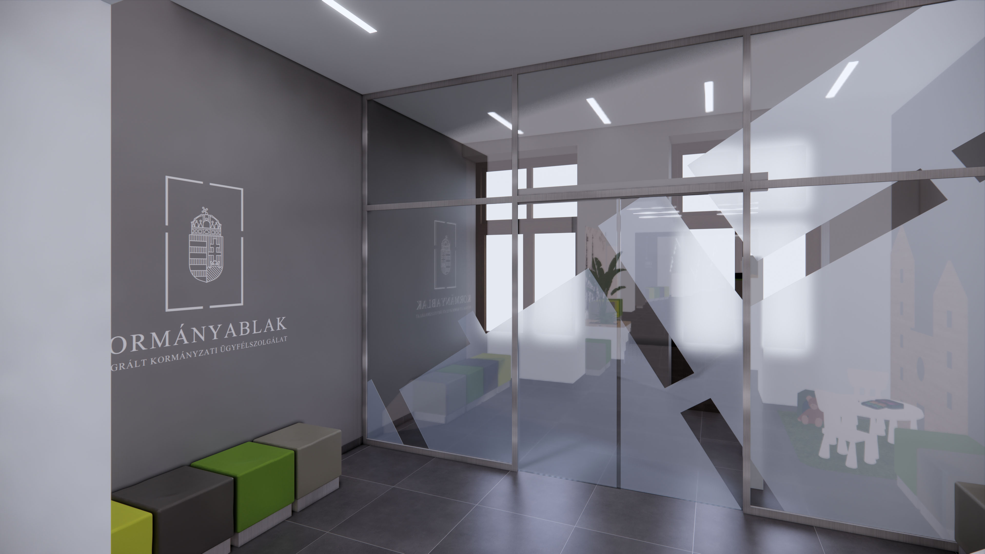 modern office entrance with a clean minimalist design the floor is grey gress tiles bright white ceiling panels with recessed lighting enhance the clean sophisticated look the counters are clean white with charcoal grey accents complete natural cool sun light comes in through the windows there are a few clients and office workers in the space