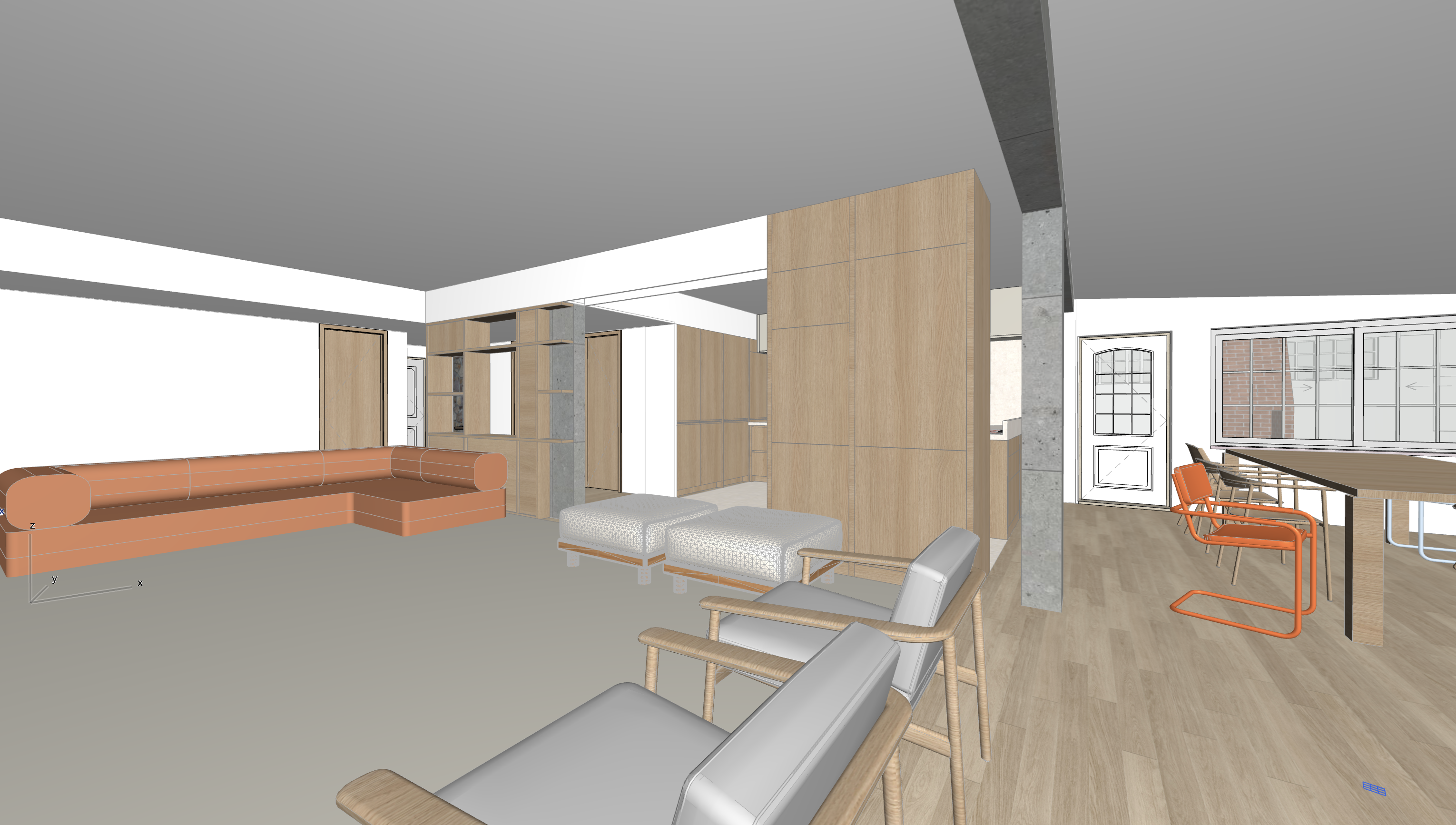 the grey surface on the flor is a fluffy rug the orange sofa on the left side of the image should be made of corduroy fabric