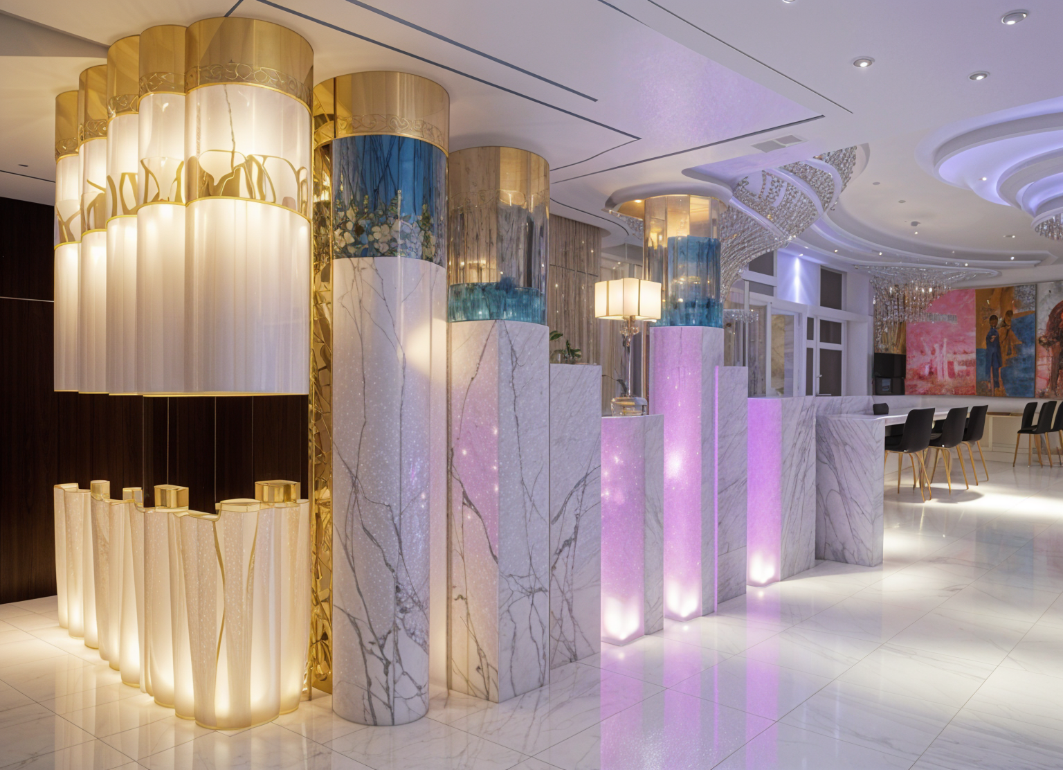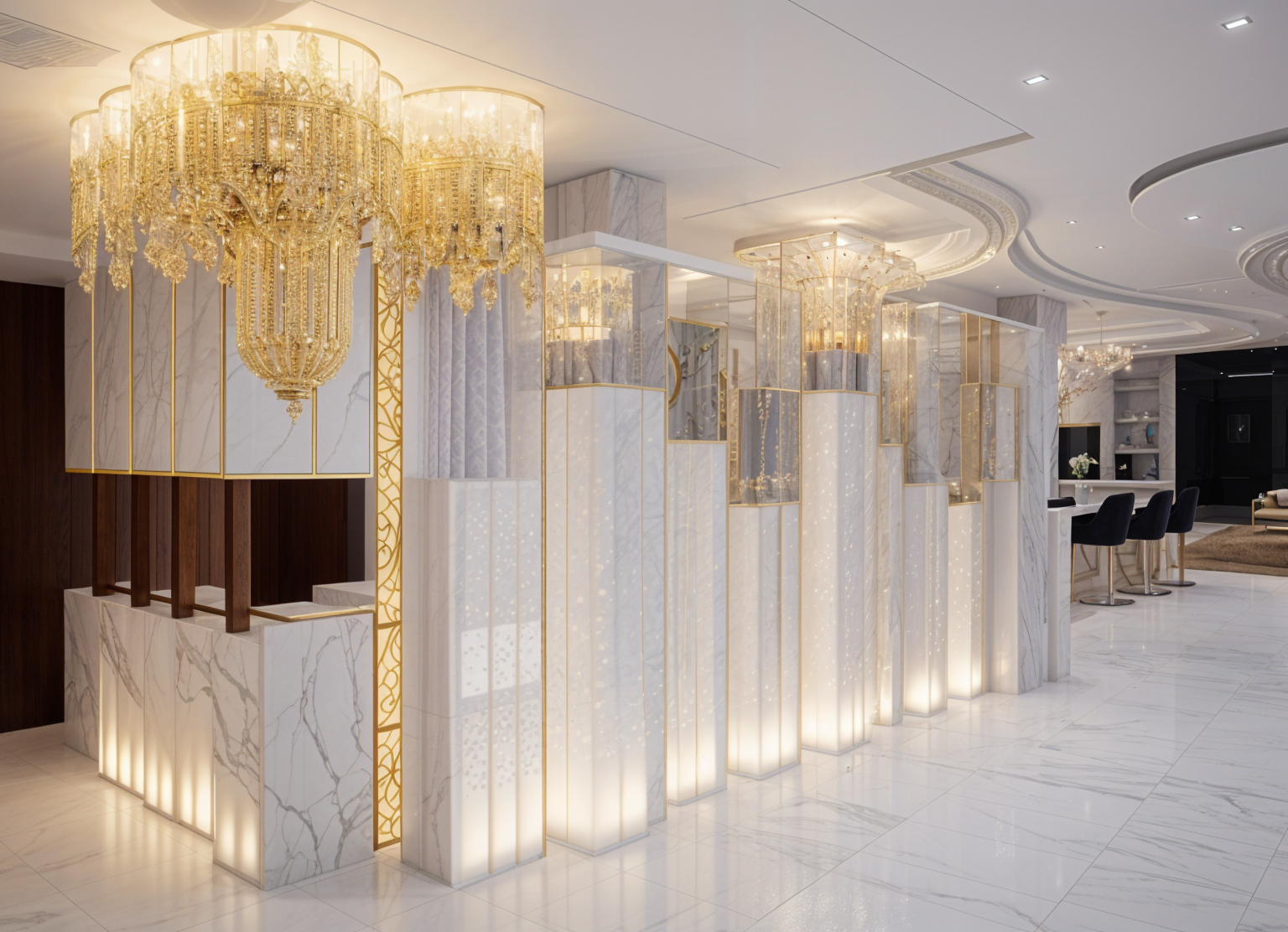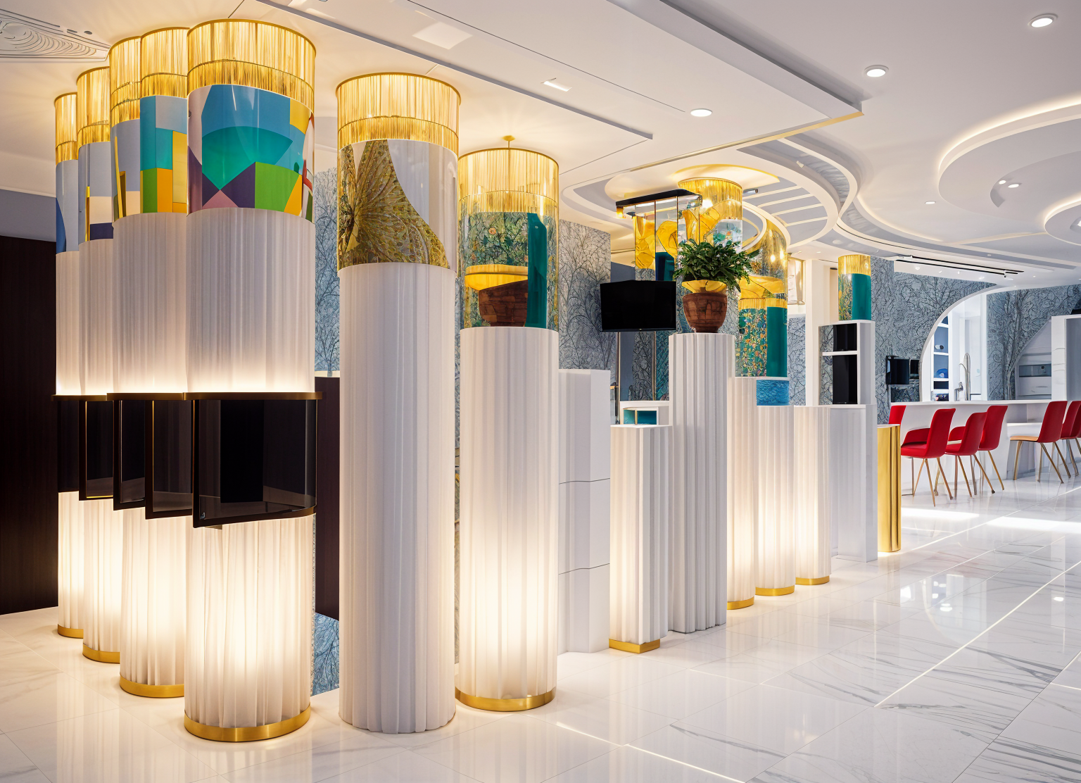 design a creative life lobby facing a partition wall hanging chandeliers and innovative design instead of pillars in the picture architecture