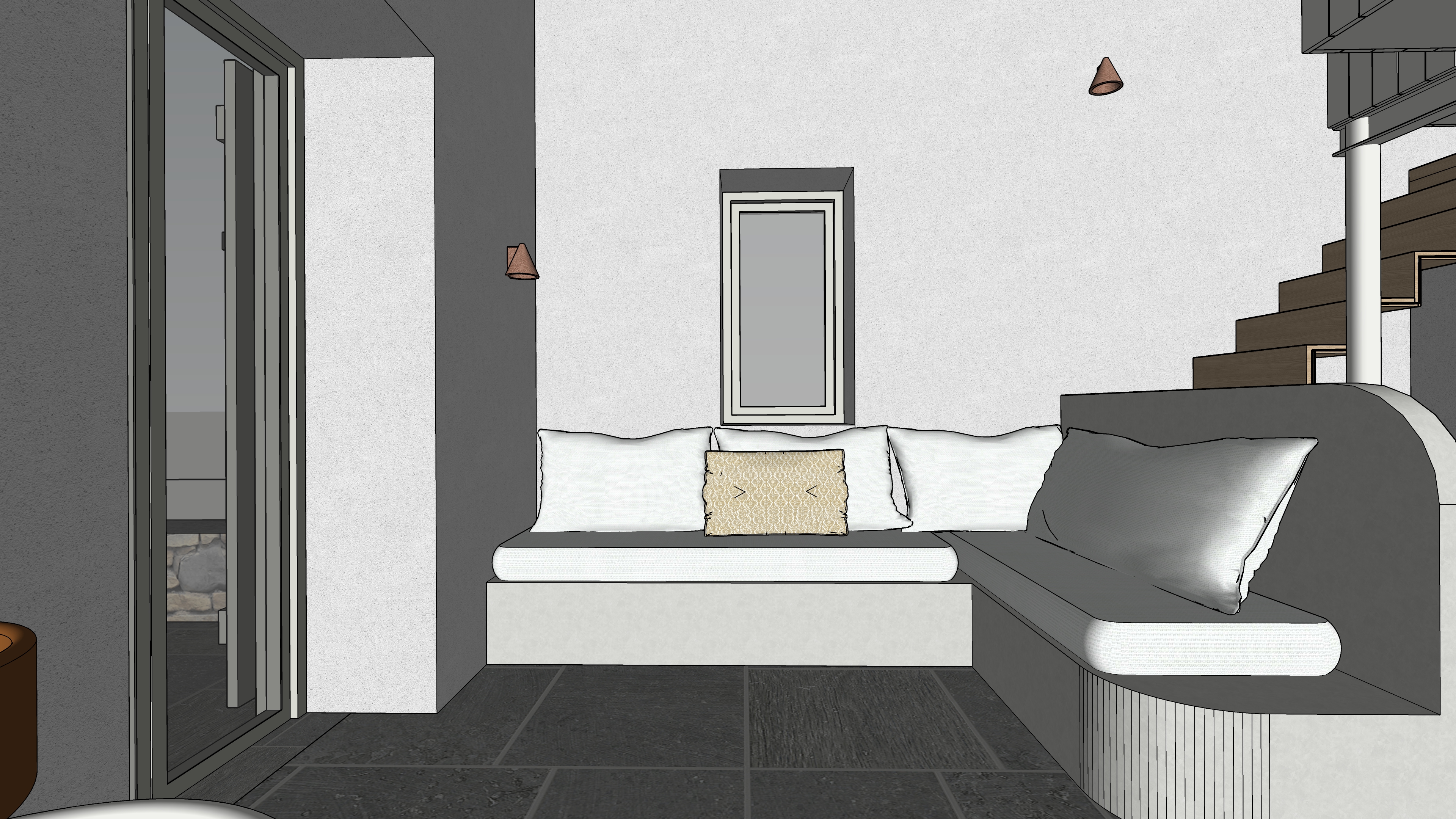 main prompt this is a cycladic house in kythnos the floor is natural gray pelion stone the sofa is white cement paint the sofa fabrics are light cream there is wooden stair leading to the mezzanine which is made of metal and wood in white color the stair is light oak wood the window frames are sage green the walls are white there is natural light negative prompt do not change geometry do not add objects do no change colors or materials