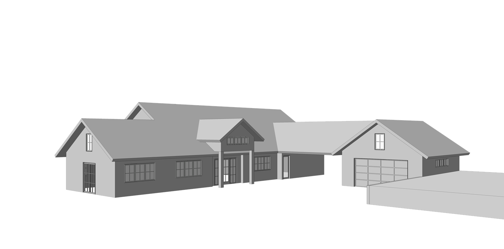 exterior shot modern farmhouse residence light board and batten siding metal roof driveway in front large trees in back