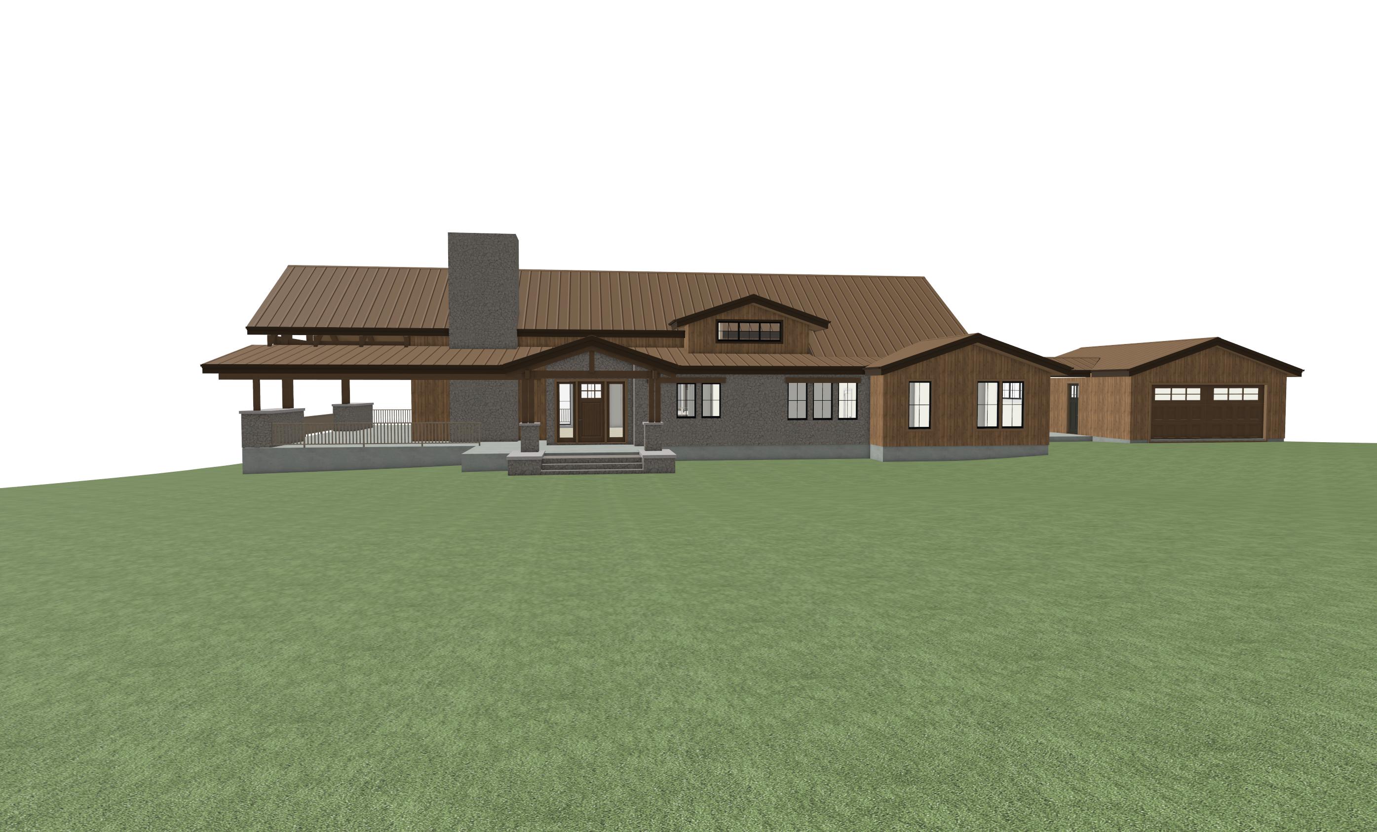 this house is in montana add pine trees and native montana vegetation make wood siding ghost wood like jackson hole house keep rock on face of house make oustide golden hour make golden light coming from inside house add fire pit to patio make rock patio that wraps around left side of deck its a big rock patio starting from left side of front entry and wrapping around left side of deck