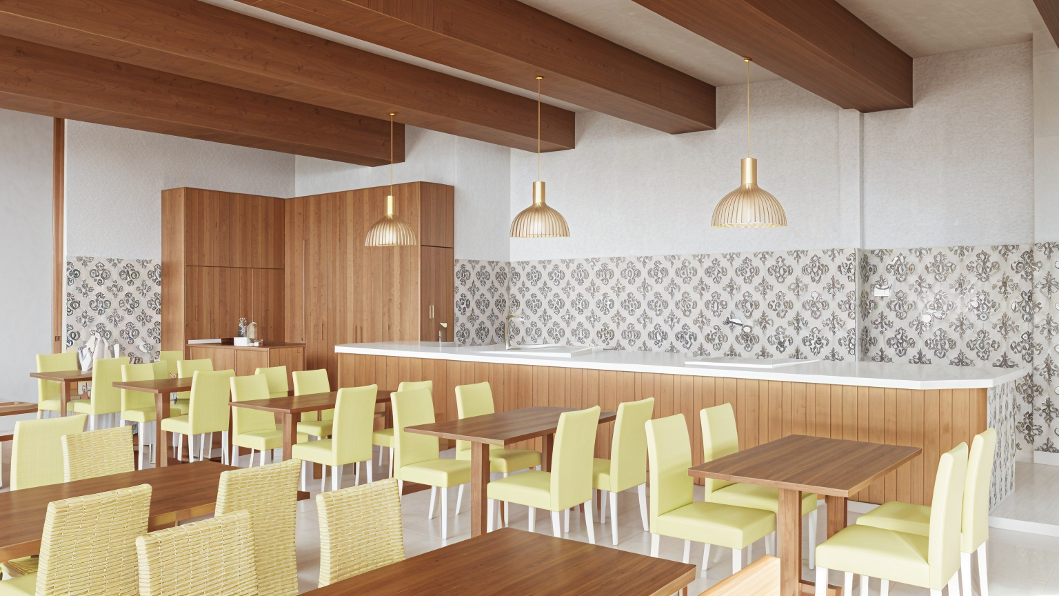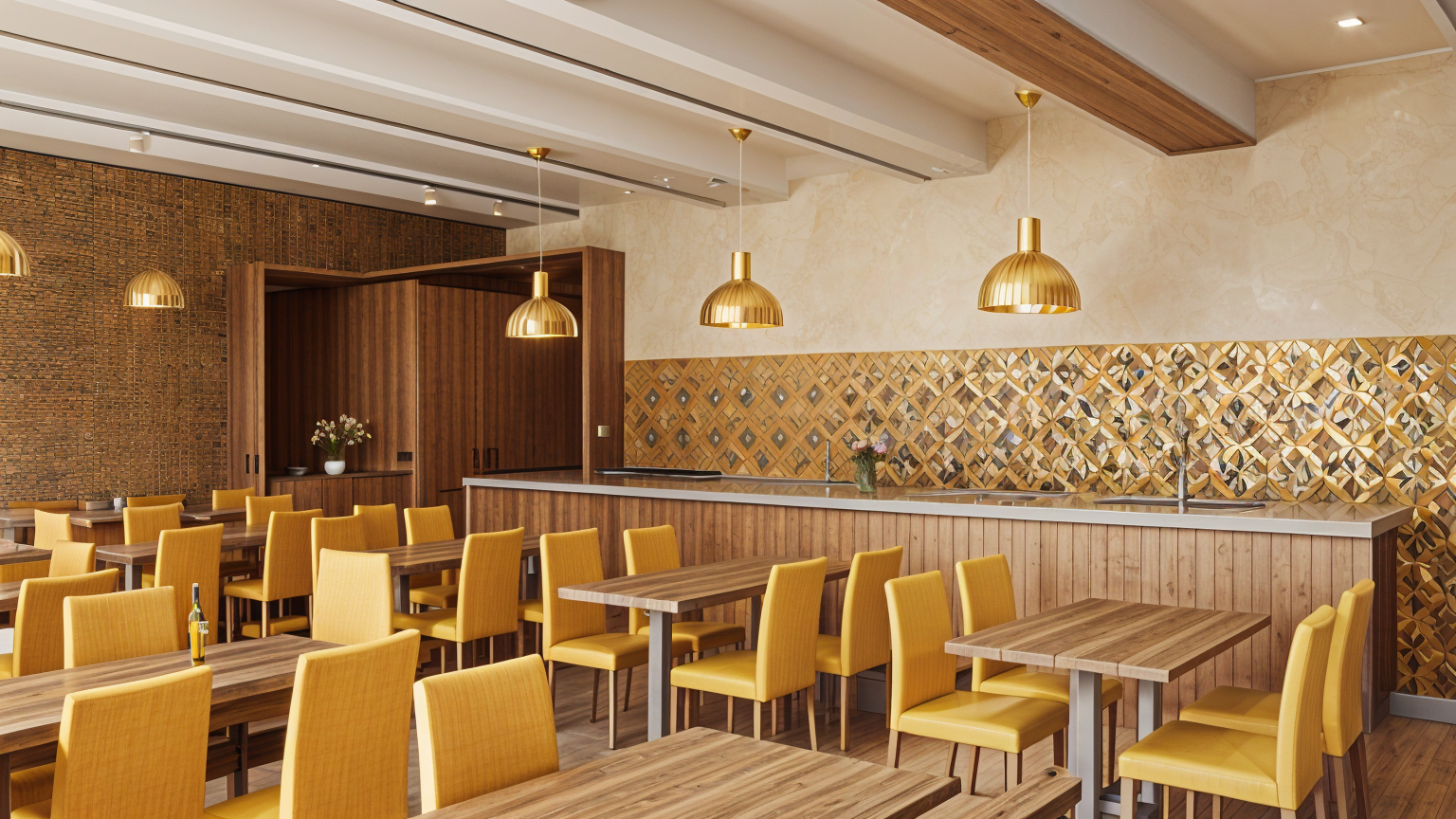 turn this image into a more accurate render i want the facade to be a dark red brown brick with the brick orientation responding to the geometric pattern in the image keep the door glass and the window on the far left glass also the sign that says the bedford make that in a dark brass with the front of the letters in white illuminated the awning that it is attached to can be in a dark grey architecture
