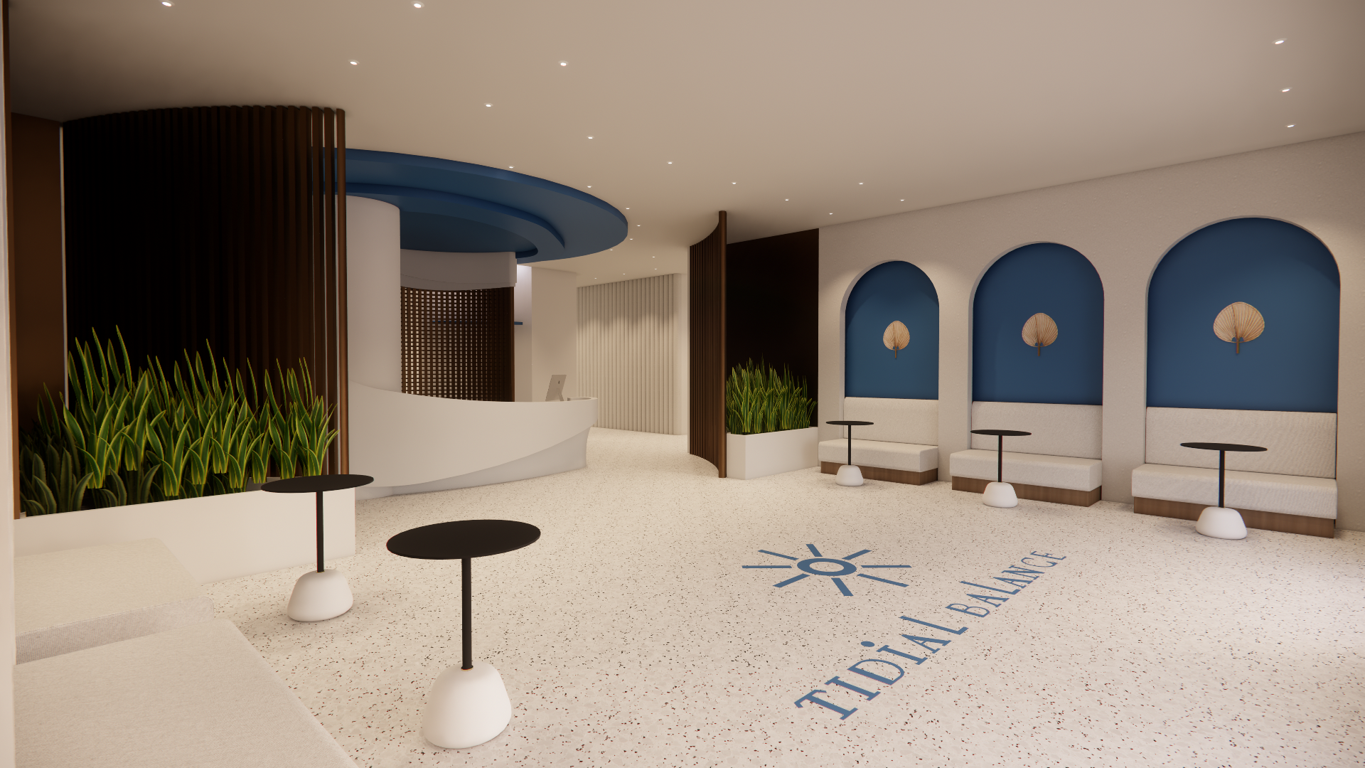 render this realistically change the plants to different plants add a simple blue marble to the reception desk