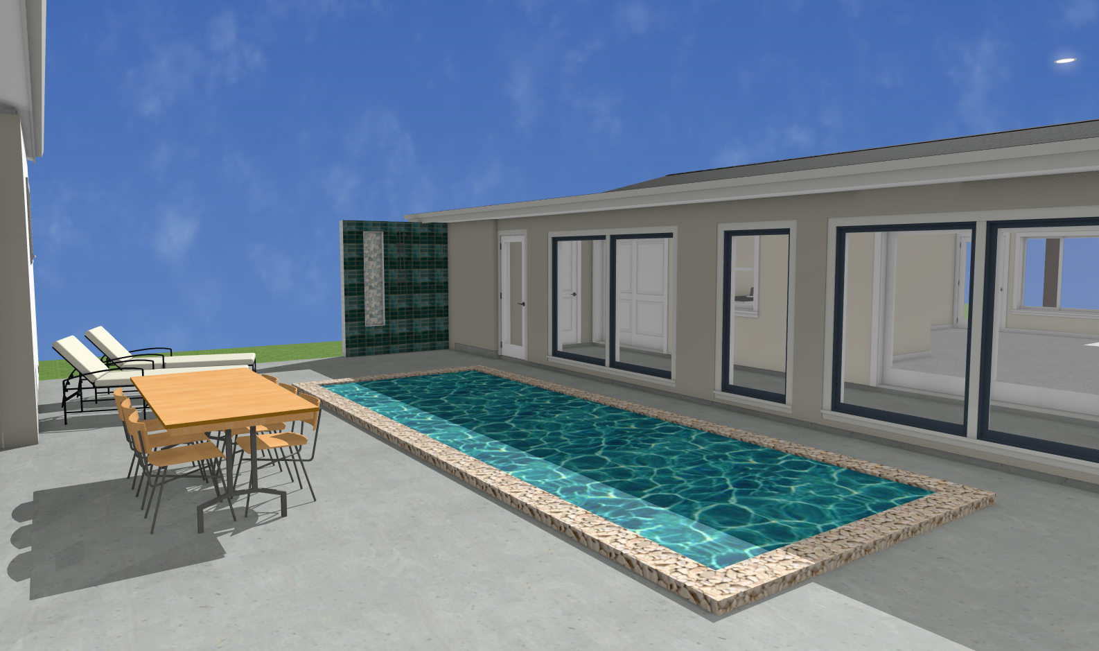 create a photo realistic image of this pool deck with contemporary furniture the pool deck to be a shell travertine very light and white contemporary the facade of the house should be white as well keep the green tile shower wall on the far end