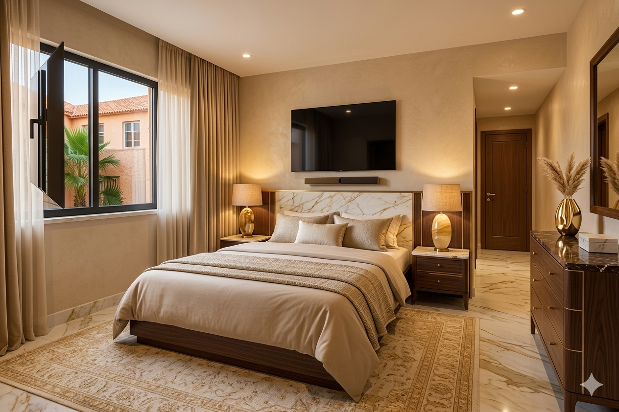 inserisci materiali come marmo e legno scuro in una parete decorativa dietro la testiera del letto