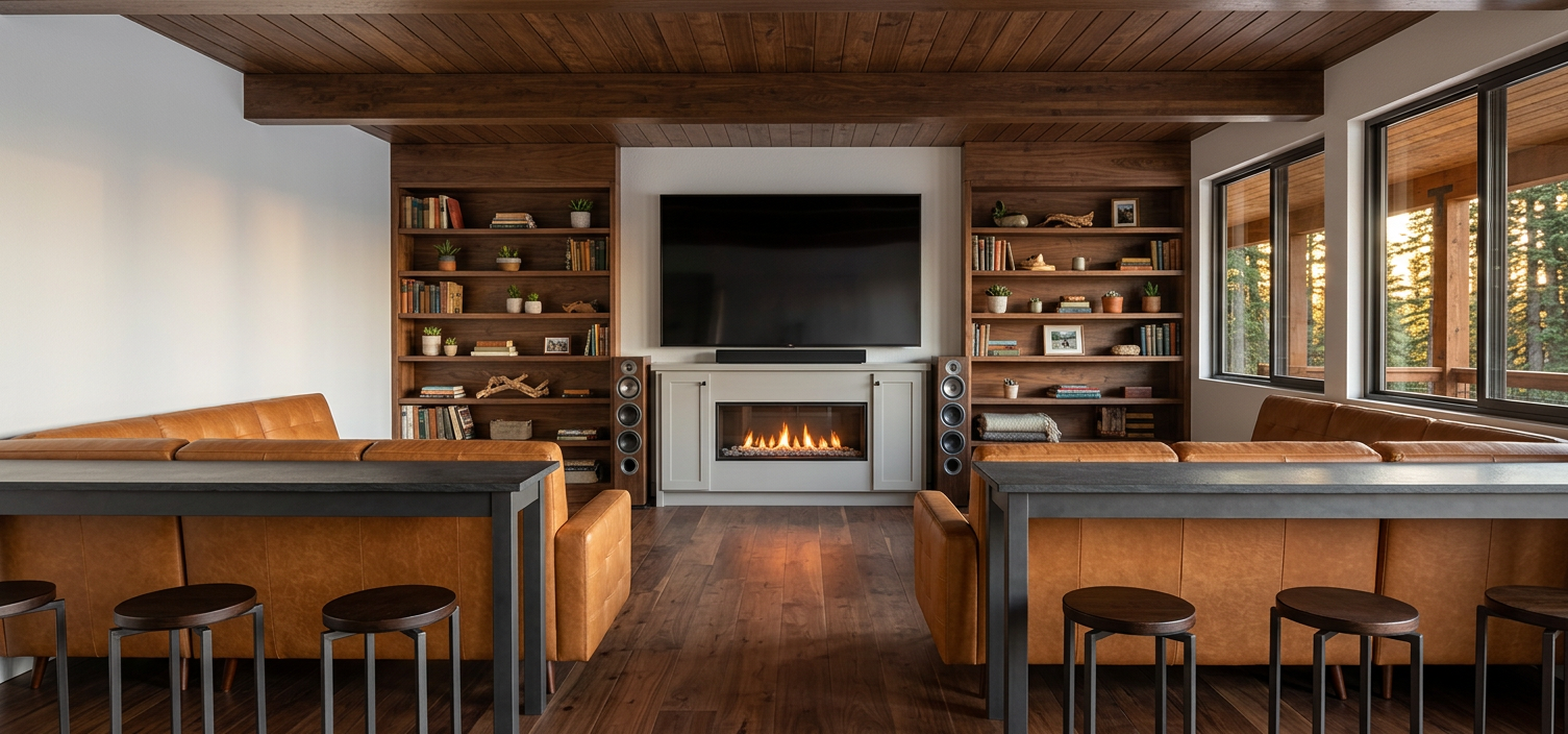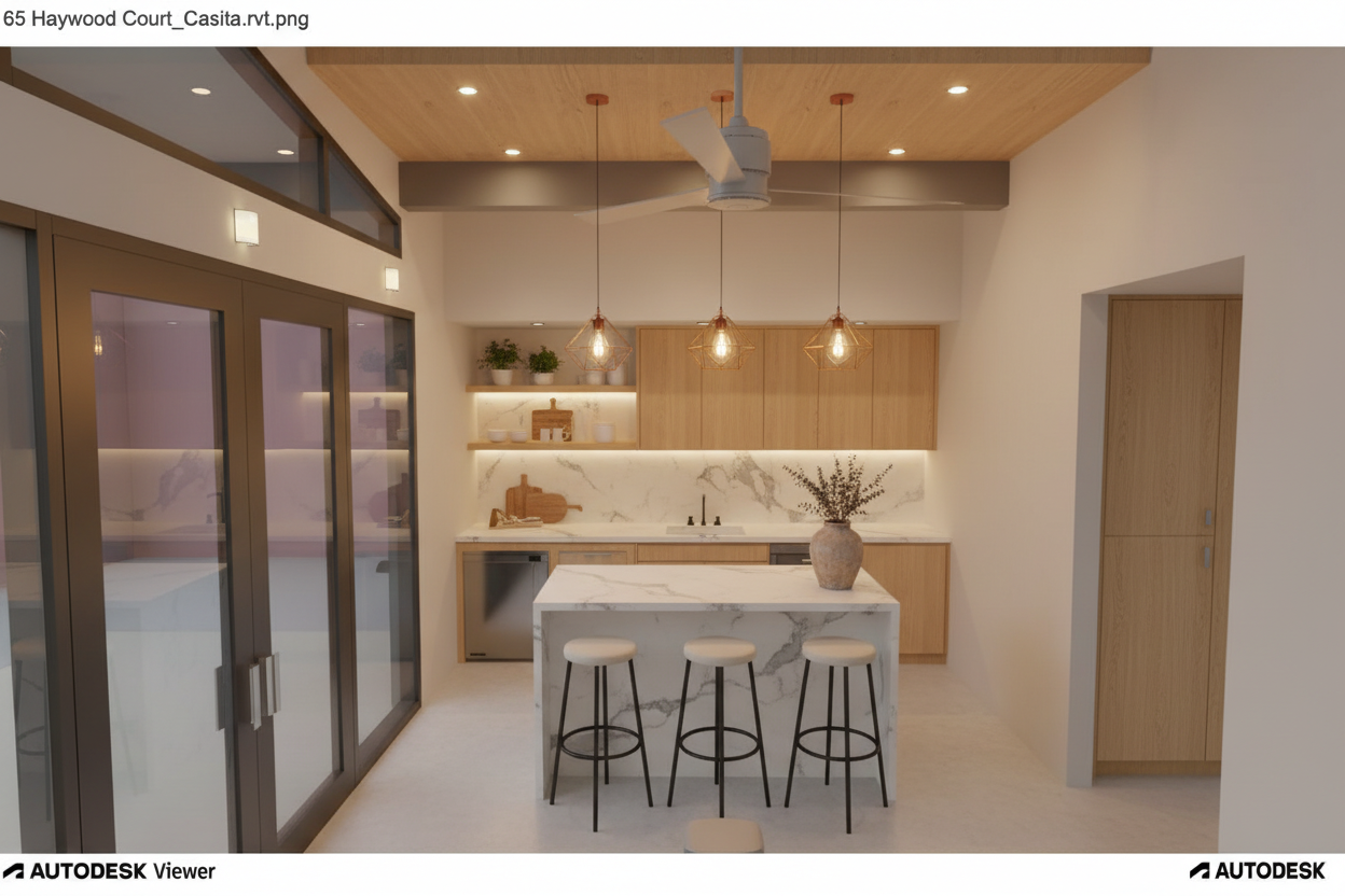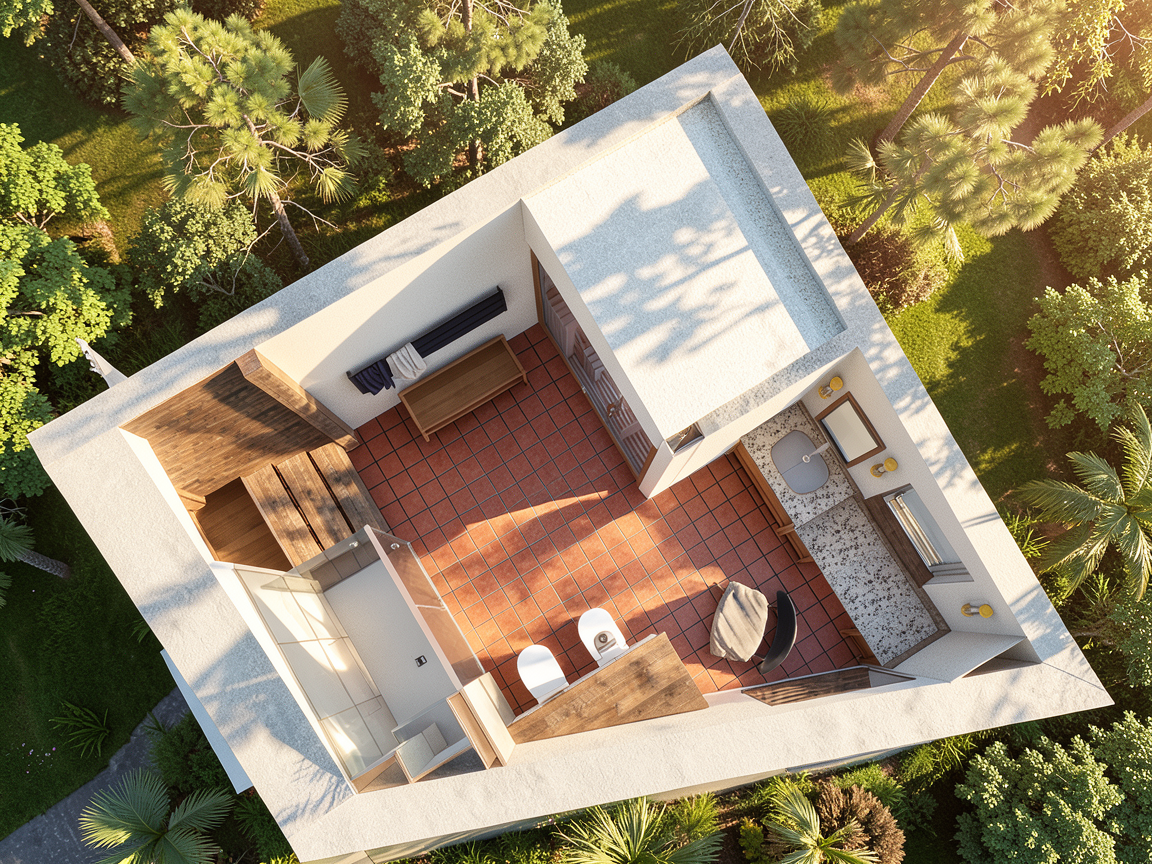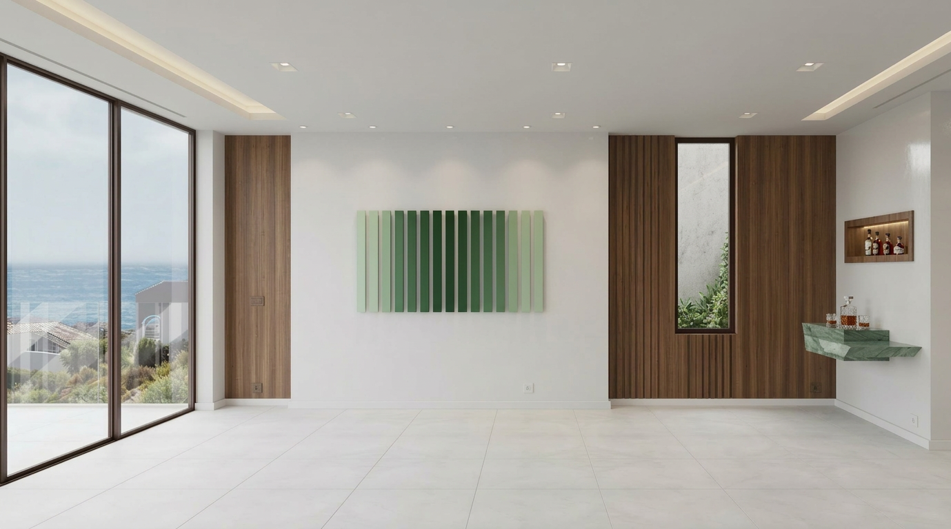 enhance into a high resolution 4k photorealistic architectural render strictly preserving the exact geometry orientation no cropping or zooming object placement and general lighting while applying the following detailed enhancements and refinements flooring the entire visible floor area of the interior living room bar and the entire extensive balcony must be paved with a unified high definition surface of large format matte finish white porcelain tiles from the i naturali collection specifically the bianco lasa model featuring subtle grey veining and minimal clean grout lines the tile grid should be clear and distinct across the entire visible floor space resolving the previously low resolution areas bar decor the bar top must be refined remove all previous bottles shakers and generic items place one exquisite fancy elegant crystal decanter filled with whiskey and two matching elegant glasses partially filled with amber whiskey in their place this refined setup is the only decor on the bar top the recessed shelves in the background niche remain as they were with the whiskey bottles artwork on wall the green slatted piece this panel of vertical green slats must be rendered with significantly thinner and sleeker individual wood members than currently depicted creating a more refined and minimalist aesthetic the entire panel of thinner slats must follow a complex and specific mirrored color gradient pattern the color on each individual slat transitions starting from the far left slat the gradient is lightest pale green it progressively deepens across the subsequent eight slats to a rich darkest green in the middle the ninth slat is the darkest and from that point the color pattern perfectly reverses from darkest back to lightest mirroring the order of colors across the first eight slats so that the far right slat is also the lightest pale green creating perfect color symmetry across the entire panel five circular spots the five circular recessed spotlights in the ceiling above the green artwork must be made significantly smaller and more minimal nearly disappearing into the ceiling plane while still casting a refined and focused light preserve all particularities existing geometry and placement of all preserved objects sofa rugs coffee table with book candle side tables large potted plant bar stools wooden console unit and all balcony furniture exactly as they are the entire window wall with existing glazing and glass balustrade structure the background city skyline and natural daylight conditions existing material choices for all non flooring items soda fabric rugs wood metal glass etc do not remove existing recessed rectangular spots keep the adjustment on the 5 small minimal spots over the arwork also the light f the spots should be on not off d not add furniture on the balcony background and plants slightly enhance fidelity and resolution of the exterior background city skyline buildings sea sky and the plants maintain the exact geometry placement and shapes of all original elements apply hyper realistic textures to the leaves and bark of the existing plant models and add sharp detailed window features onto the existing distant building shapes the final background view must look like a high resolution highly detailed photograph of that exact scene with enhanced lighting for depth but absolutely no geometric alteration do not add any new objects remove anything not specified for refinement bar top clutter and old art form or alter the image framing maintain a precise 4k photorealistic finish