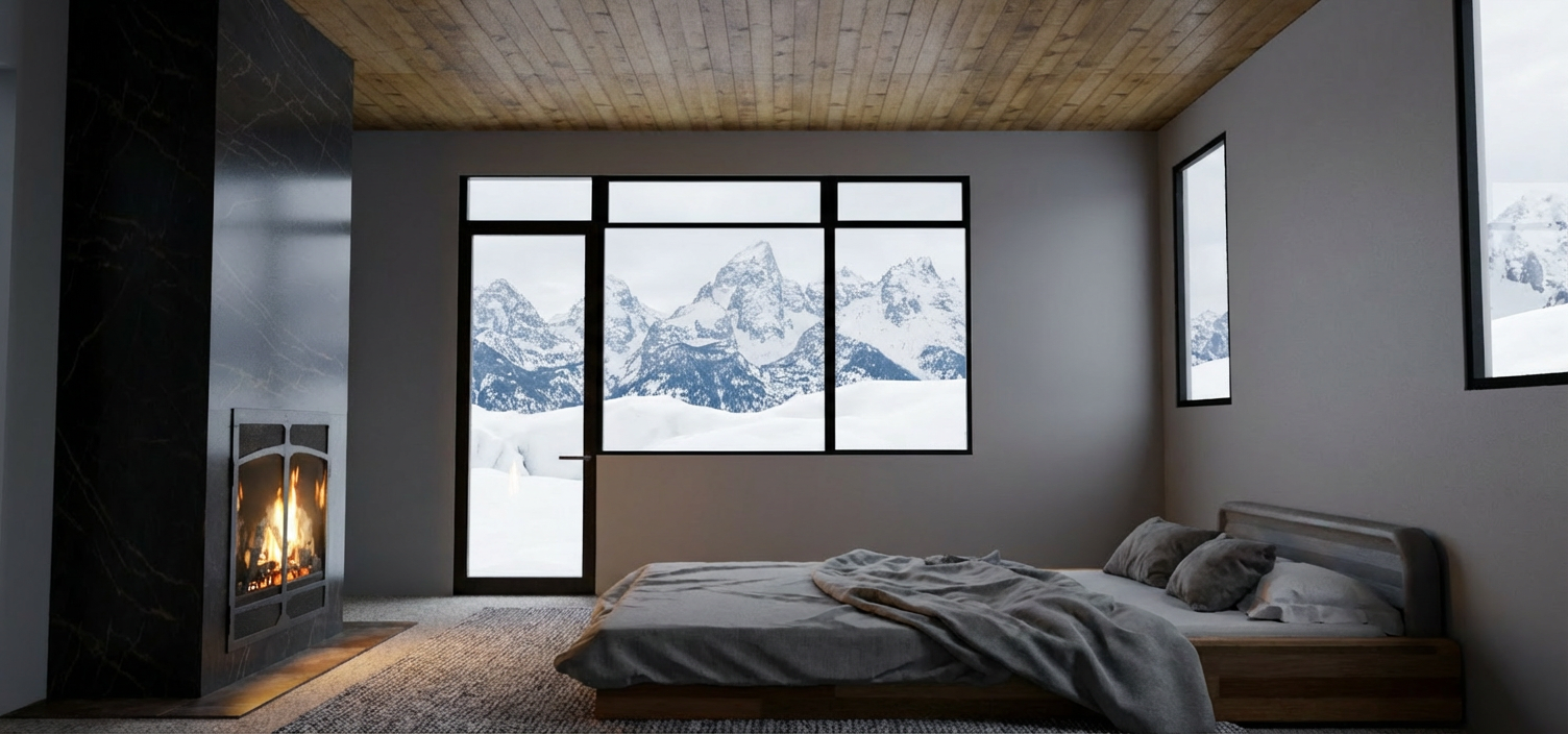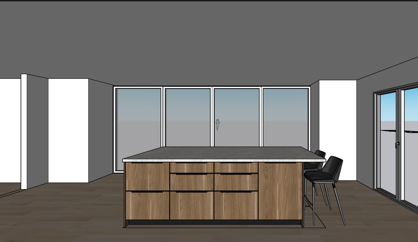 render a modern interior kitchen scene with a minimalist design the kitchen island features a polished taj mahal marble countertop contrasted by walnut wood cabinets with a natural grain finish add sleek black modern bar stools with a matte finish use a warm ambient light source to create a cozy atmosphere highlighting the natural wood textures include large floor to ceiling glass windows with a veiw of the backyard with plants and trees casting gentle reflections on a dark hardwood floor the walls should be a smooth elegant off white complementing the overall sophisticated aesthetic