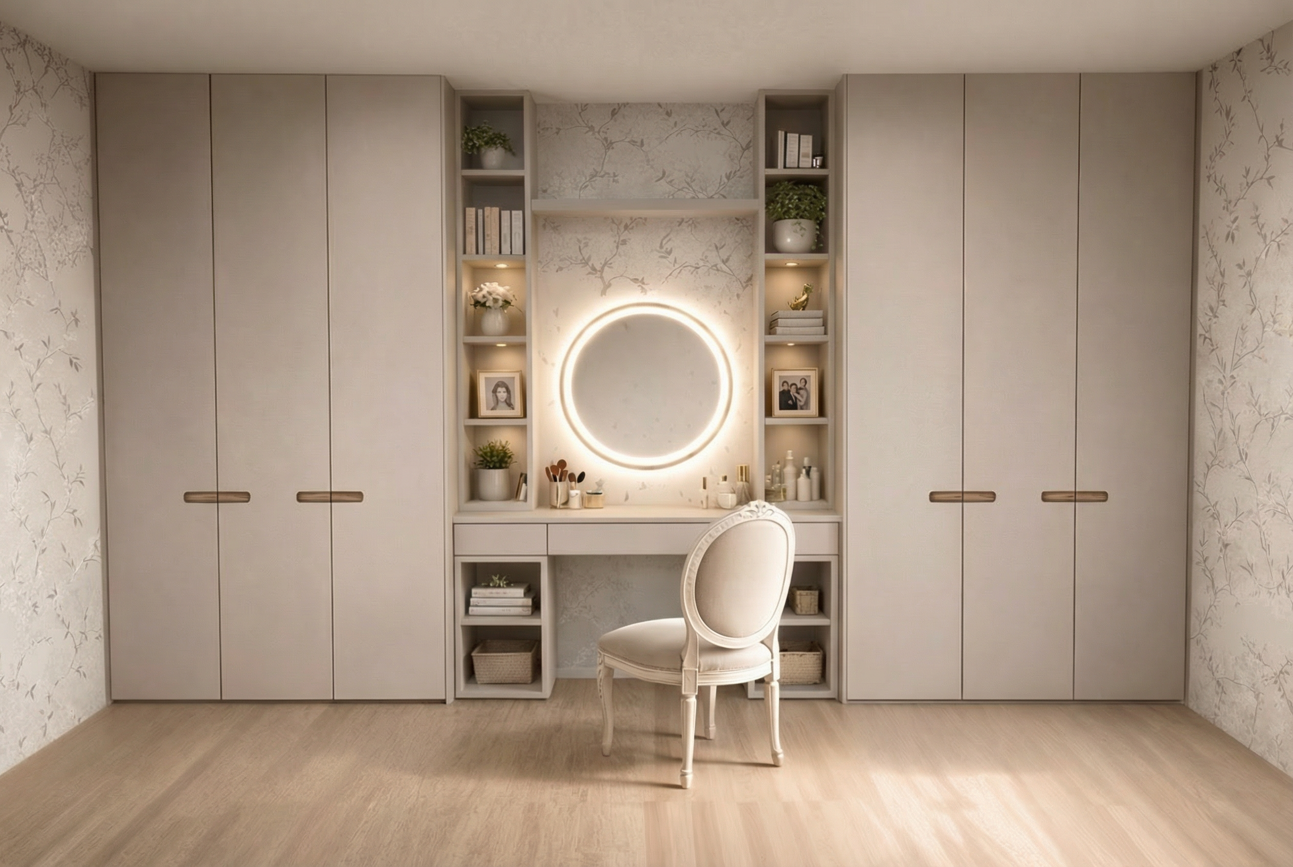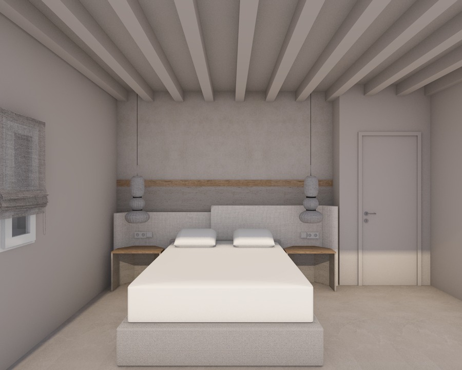 create a high end photorealistic render of a bright luxurious bedroom with a refined and expensive feel the materials should feel authentic with realistic texture the flooring is matte with a polished cement look in a sand off white shade cohesive and elegant the lighting should be warm natural and balanced maintaining a bright atmosphere add beautifully arranged high quality bed linens with soft folds and a soft aesthetic the overall mood should feel contemporary sophisticated bright and editorial as if photographed for a luxury interior design magazine keep the initial materials like cotton linen travertino light oak wood the pendant lights avove the nightstands have fabric like surface has fine pleats head bed linen sand texture