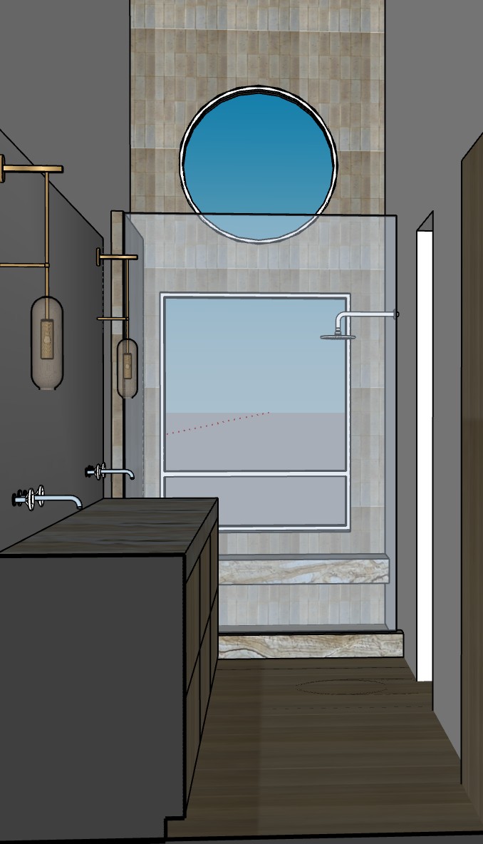 add landscaping and lighting windows on west wall only copy finishes like model light oak floors light oak vanity and stone countertop blue grey shower tile white walls light oak door