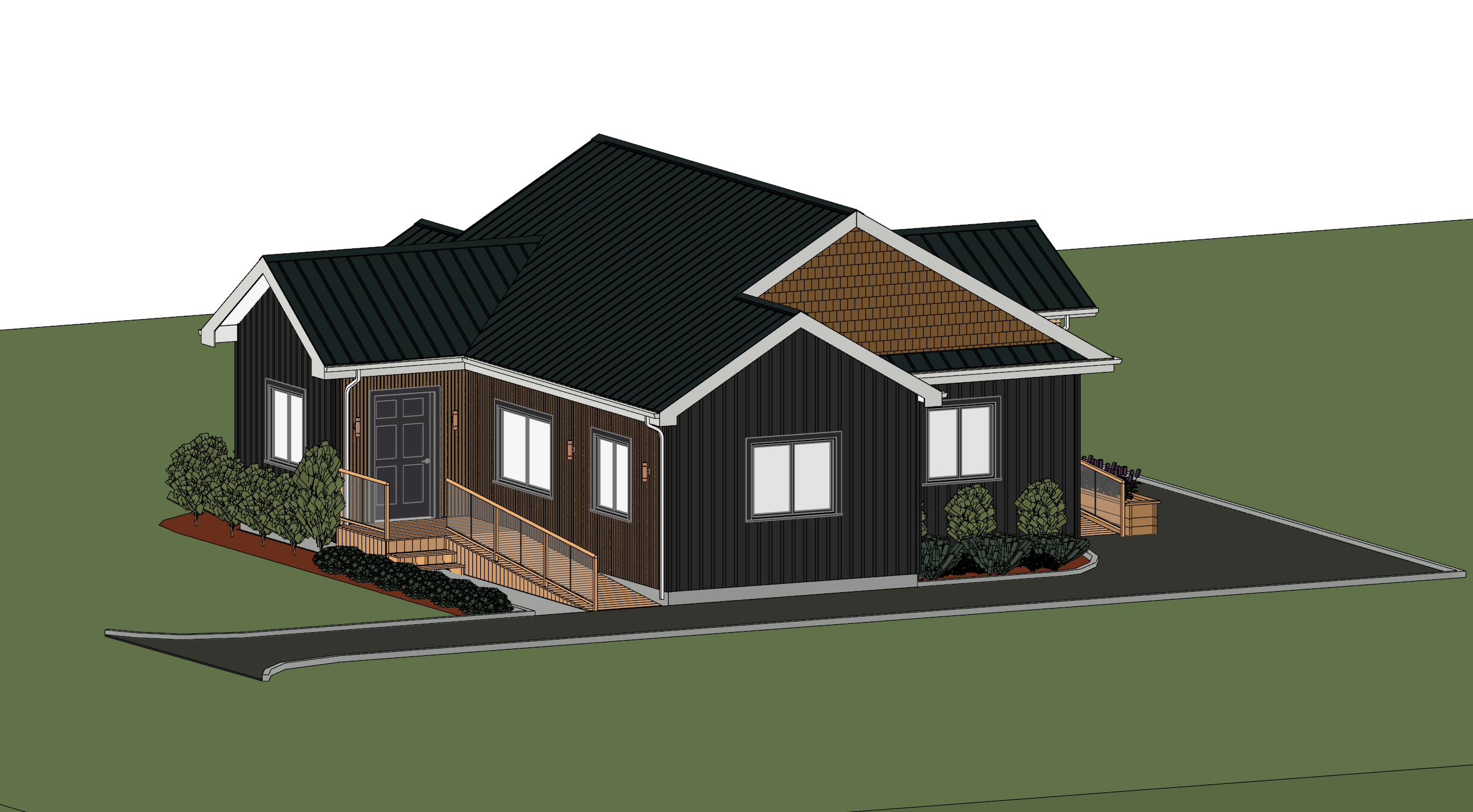 exterior shot do not change the colors refine the image into a high quality rendering with trees and residential houses that match the style of the image sunny summer day dont add any new windows or doors do not change the size of any windows or doors either