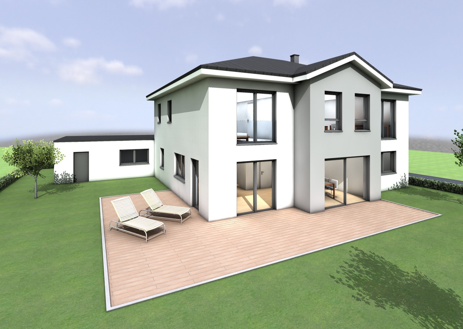 green garden pathway to terrace plane on sky bricks only on the grey facade