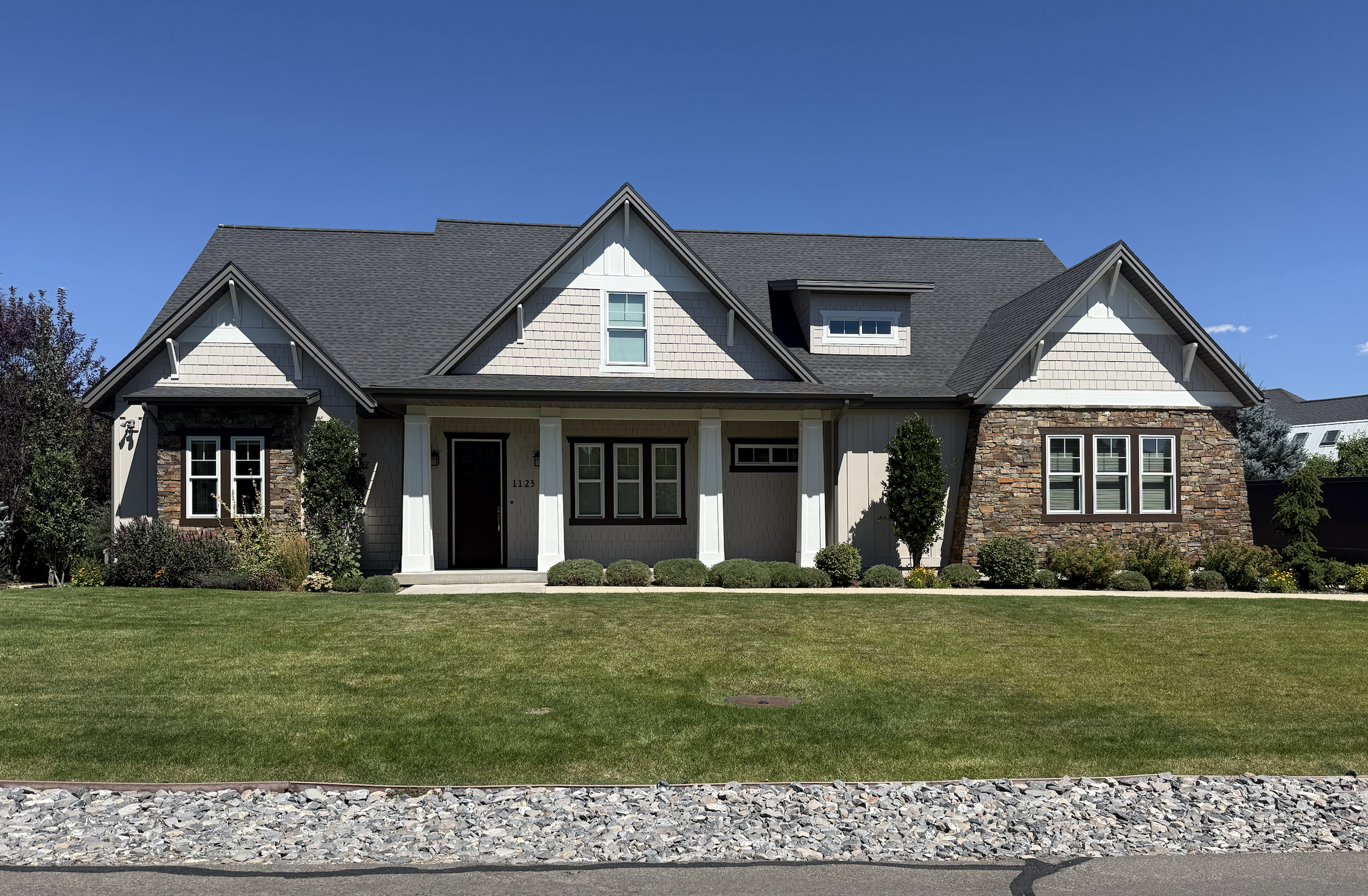 i want to brighten up this house and get rid of the red tones i d like to keep the siding and shakes the same change the brown trim around the windows to white replace the stone with merrelstone castle cove stone replacing the stone on the right hand side the stone should go all the way up to the roofline the front door should be wider and a white oak stain the fascia should be black like the roof