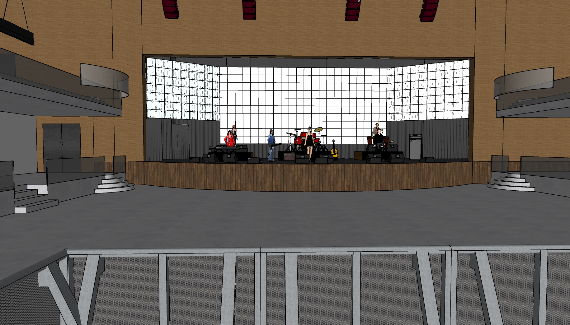 tadao ando night shot designed by zaha hadid interior shot night scene perspecctive is from the from foh use an excited full audience new urbanism perspective shot keep the exact camera angle distance and perspective from the supplied image do not move the camera or change focal length convert this scene into a photoreal upscale nightclub at night preserve the architecture exposed steel trusses balcony railings ceiling height stage shape wood fascia rigging positions and the single led wall do not change the geometry the audience area in front of the stage is a sunken dance floor that sits lower than the surrounding level the perimeter walkways and lounge platforms around it are higher preserve this elevation change do not flatten the floor levels add dramatic stage lighting with visible beams and subtle haze originating from the existing fixtures on the truss the single led wall should be slightly dimmer than the stage lighting display one unified abstract motion background clean and consistent no collage no text no logos no photos add a rectangular picture in picture imag overlay inside the led wall content as if routed through a switcher the led wall is the only screen do not add any other displays add upscale lounge seating with premium materials like leather velvet brushed metal and dark wood around the higher perimeter areas increase patron density patrons should face the stage and pay attention to the performers use polished concrete flooring with soft reflections lighting is warm and architectural mood is modern exclusive energetic concert ready architecture architecture there are overhead light trusses above the stage it should be dimly lit wiht dramatic breams from mild haze architecture