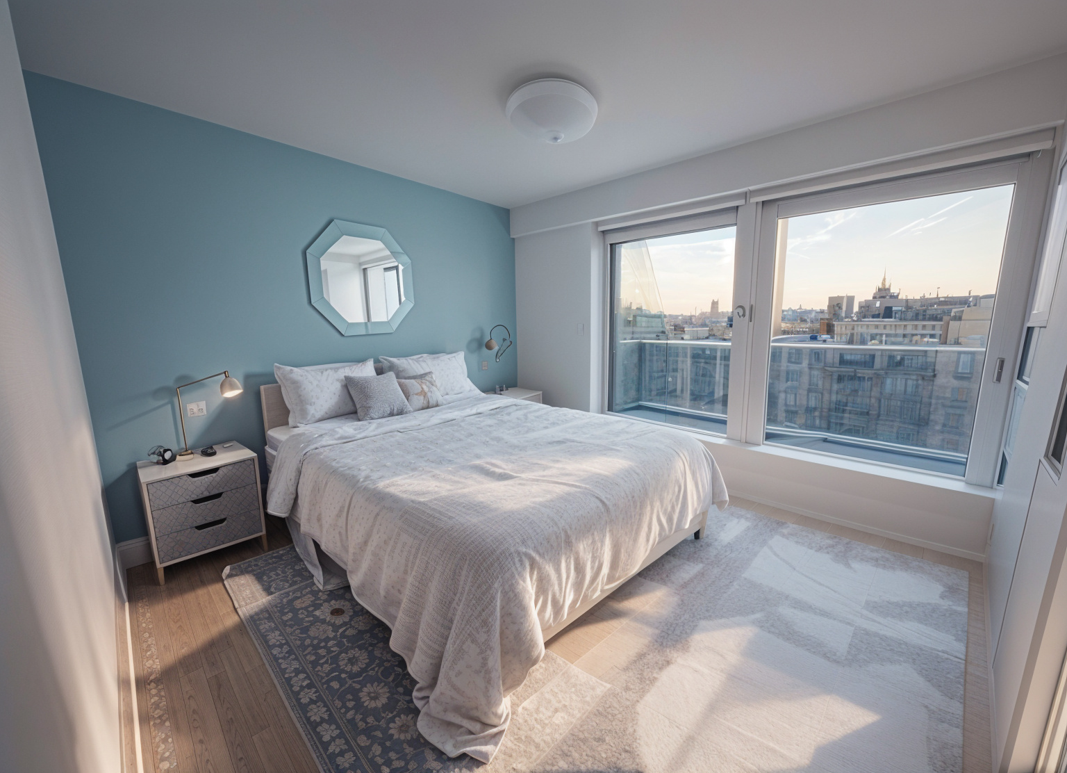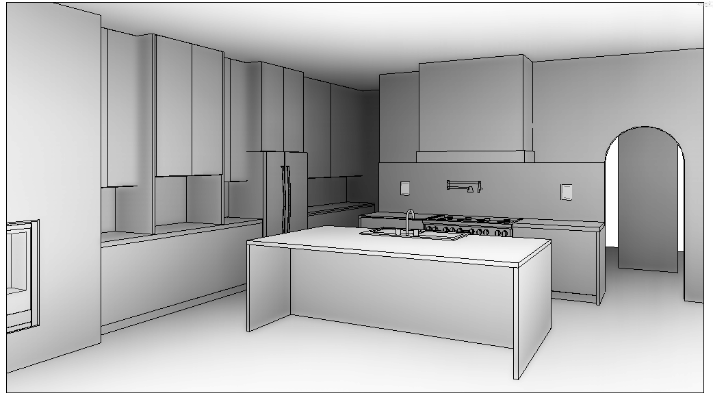 a modern kitchen with sleek minimalist design cabinets in matte dove gray and countertops in honed ijen blue quartzite stainless steel appliances including a double door refrigerator and professional range the walls are a soft neutral taupe and the arched doorway adds a classic touch lighting is soft and warm casting a cozy glow hardwood floors in a light oak finish enhance the elegant atmosphere architecture