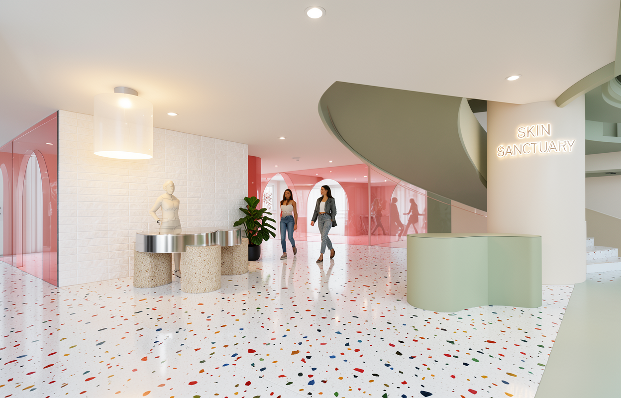 the brick wall should be a sheer curtain in an off white the ceiling cylinder pendant in front of wall should be a light white acrylic with a subtle glow inside the red floor should be a white terrazzo with colourful stones the tabletop in front of brick wall should be a silver mirror finish the legs should be in textured sandstone the round column should be in off white paint render texture with an upper case neon sign stating skin sanctuary the rooms with arch entries should be in a soft pink glass transparent finish the curved staircase should be in white gloss on the ceiling we should see downlights the plant should read as a lush fiddle leaf the people figures should read as real life females the blue table at the front should be a red marble table