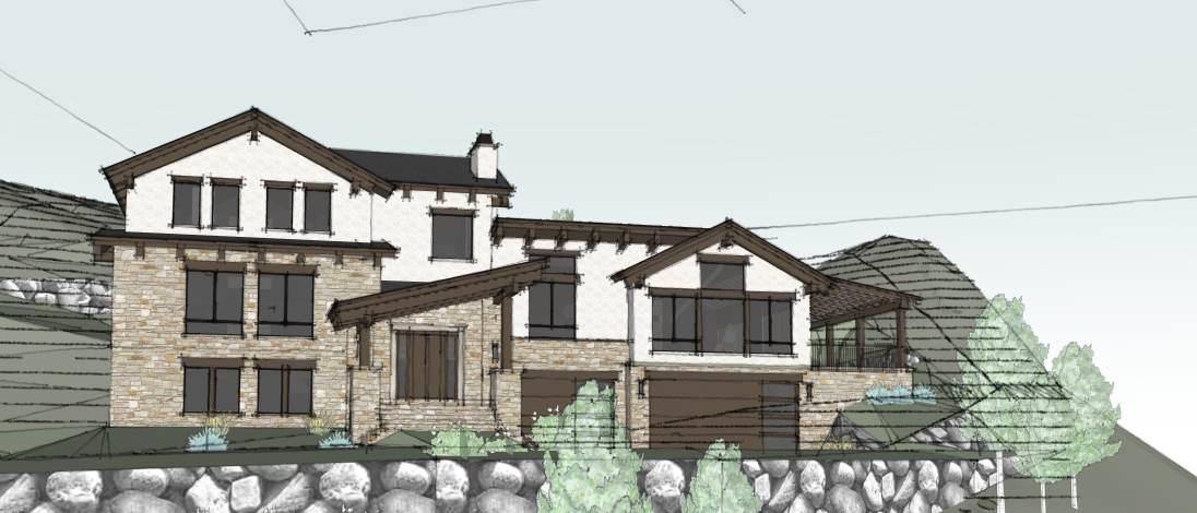 luxury mountain home stucco and stone with timber details slate roof colorado mountain home with aspen trees and pine trees boulder retaining walls wood garage doors brown window frames black iron sconces afternoon warm lighting