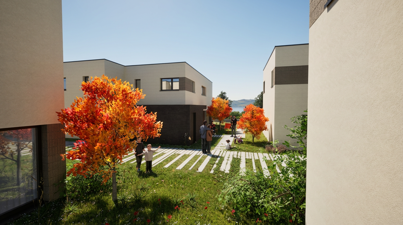 photorealistic architectural sectional view of a double height industrial loft the space features a dark oak plank flooring and a complex wall color palette the left wall is white then a deep brick red with varying terracotta gradients while the back wall behind the balck gridded glass partition is a gray pink soft pale powder pink match the color in the image the interior is furnished with iconic design pieces a lounge area with two black leather wassily chairs on a red persian rug and a white modular sofa a central emerald green curved seating element with large indoor tropical plants an integrated l shaped plywood bookshelf featuring the taccia lamp by flos glass bowl diffuser a vintage turntable and vinyl records bowie pink floyd an office nook visible through glass with an eames aluminum group chair a dining area featuring a long wooden table on dark iron legs surrounded by kartell louis ghost chairs and metallic tolix stools on the dining table sits a transparent kartell bourgie lamp standing in the background is the toio floor lamp by flos the upper mezzanine level has a white and black industrial structure glass railings and a sawtooth skylight roof that provides bright natural diffused lighting three white minimalist ceiling fans are mounted on the ceiling beams high end architectural visualization cinematic lighting 8k resolution highly detailed textures