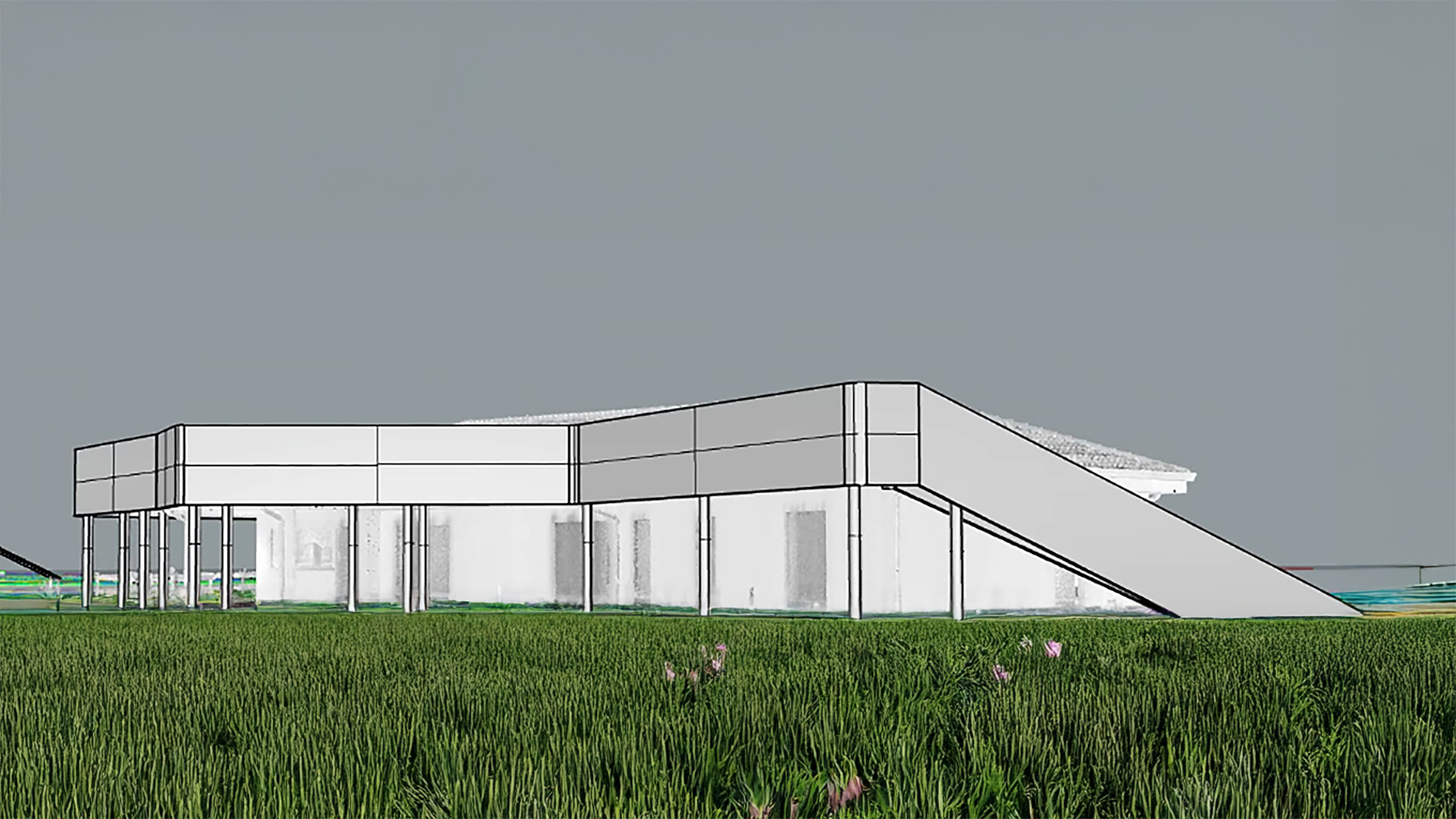 futurism exterior shot photorealistic dusk exterior of a luxury villa preserve exact building silhouette geometry no changes naturalistic pool on the lawn in front colonnaded portico behind pool with floating ribbon like walkway wrapping the house luxurious materials travertine teak brushed bronze frameless glass all windows lit from inside with warm amber glow golden hour sunset rolling hills background weeping willow and mediterranean planting slightly elevated 35mm view cinematic dof high detail materials 16 9 architecture