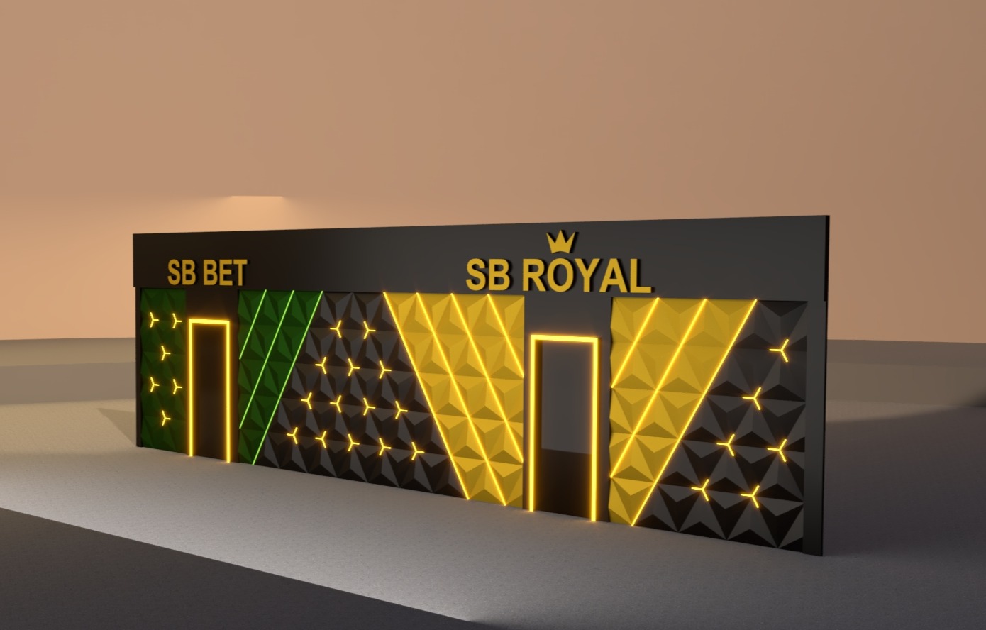create a realistic and modern exterior of a betting shop at dusk the building has a sleek contemporary design with a black facade the left section features a vibrant green metal panel contrasted with black accented by neon lines the right section displays a bold golden panel with a triangular pattern illuminated by warm yellow lighting the text sb bet and sb royal appear in golden letters adding an eye catching element the overall atmosphere should feel sophisticated and inviting with subtle ambient lighting enhancing the building s geometry against a twilight sky