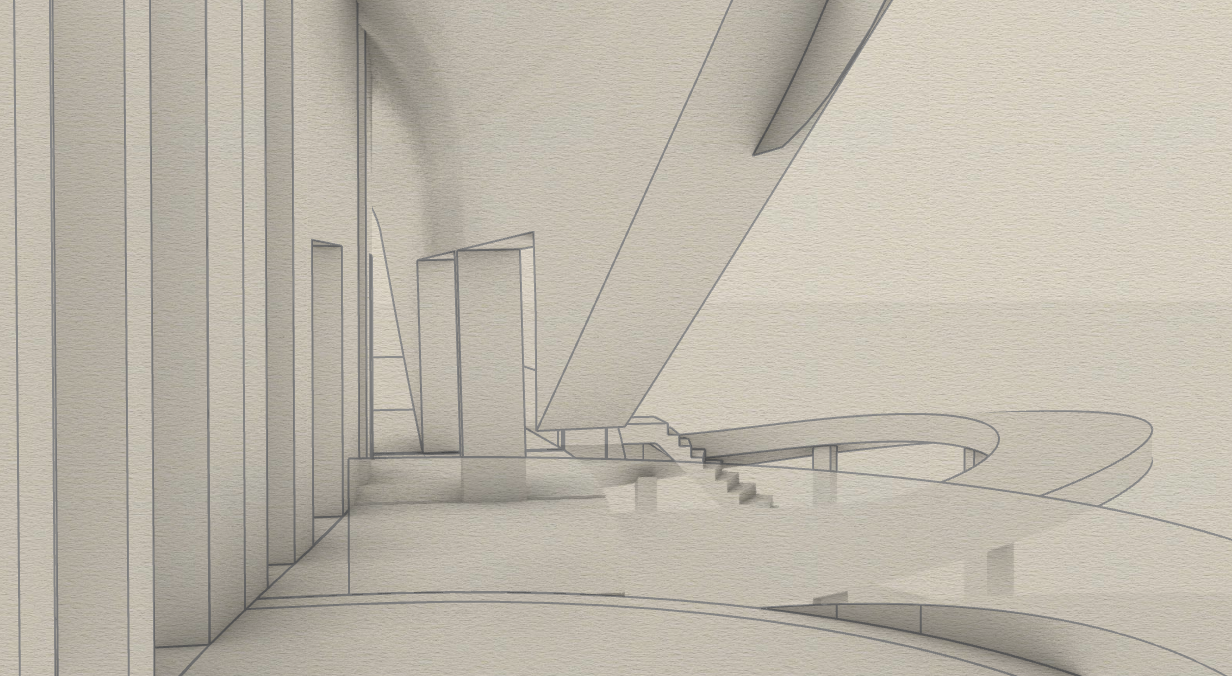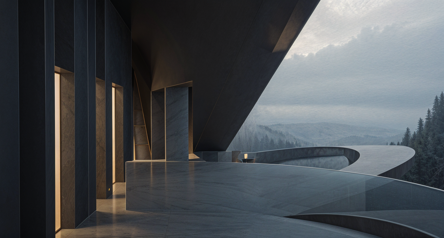 view from an upper balcony of a two story mountain research facility rendered in a neutral pencil sketch architectural style with paper texture clean linework and soft shading on the left show the tall fa ade clad in matte black metal panels with crisp vertical seams and narrow horizontal windows emitting warm interior light above the balcony depict the curved black corrugated metal roof extending outward as a cantilevered overhang the underside of the roof is visible following a smooth continuous curve that wraps over the balcony area include small recessed box like openings along the balcony ceiling and edges that align cleanly with the floor and do not interrupt the walking surface use elegant minimal balcony railings thin black steel framing with clear glass panels set the environment in bright daytime lighting soft natural sunlight clearer sky with light clouds and brighter overall contrast the balcony overlooks a steep cliff with fog and low clouds drifting far below in the distance place mountain ranges pushed far back softened with atmospheric haze but still visible and more defined due to daylight add subtle pine trees and rocky terrain along the lower slopes the scene should feel high elevation fresh and open with daylight illuminating the landscape