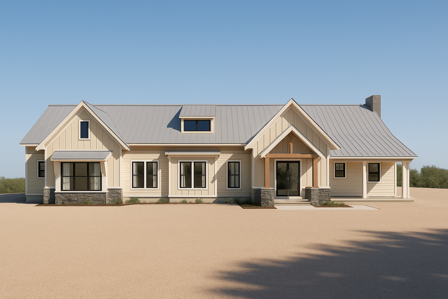 zaha hadid use the uploaded aerial image with red boundary lines and lot layout as the base geometry reference create a conceptual residential subdivision site plan rendering showing a custom home community on approximately 25 acres in rural texas follow the provided lot layout and internal road configuration exactly keep all lots inside the red boundary lines design intent one acre residential lots custom single family homes centered on each lot asphalt private road network shown in gray in the reference image main site access from cr 2465 at the north property line preserve the irregular southwest lot geometry maintain three primary lot rows west center east rendering style aerial master planned community illustration soft natural landscape tones mature trees along property edges lightly landscaped front yards concrete driveways from road to homes subtle shadows and realistic grass texture rural texas setting architecture style texas custom homes brick and stone exterior materials gable roofs with asphalt shingles 2 car garages varied home orientations for realism environment open pasture surroundings tree clusters near edges of property pond visible to the southeast of the site cr 2465 labeled along the top boundary output produce a high resolution conceptual site plan rendering suitable for a developer presentation board architecture