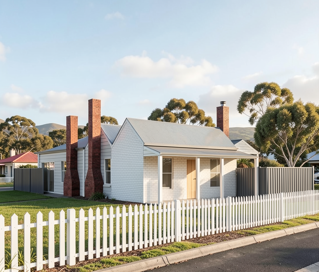 regional town in australia landscape exterior render front of house is a lightly rendered white brick all chimneys the same height white picket fence 1 2 meters high 5 meters away from the front of the house dark grey grey colorbond 1 8 meter high fence on both sides 8 meters away from the house on the left remove all roads no return on picket fence bigger block
