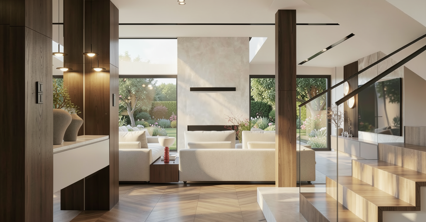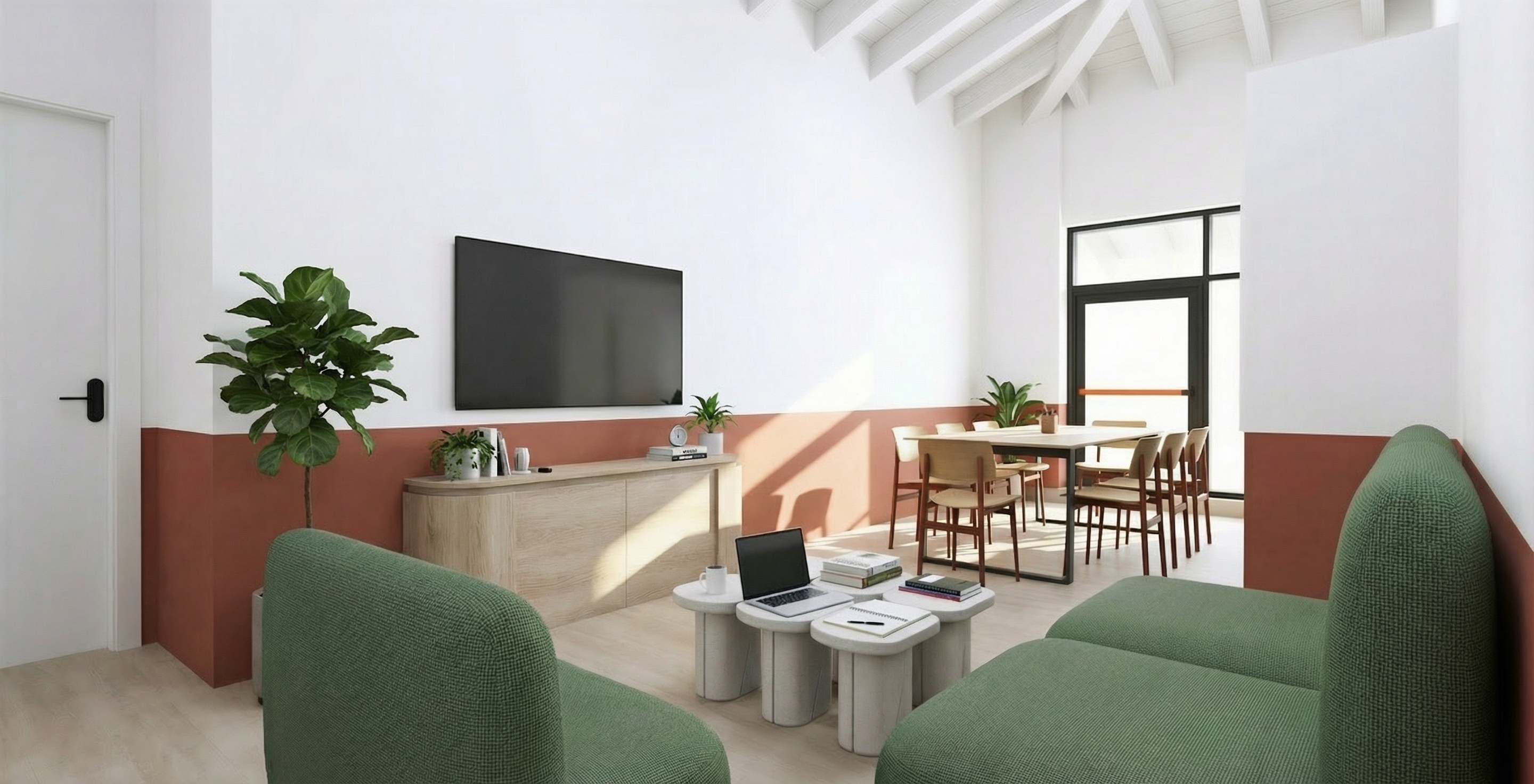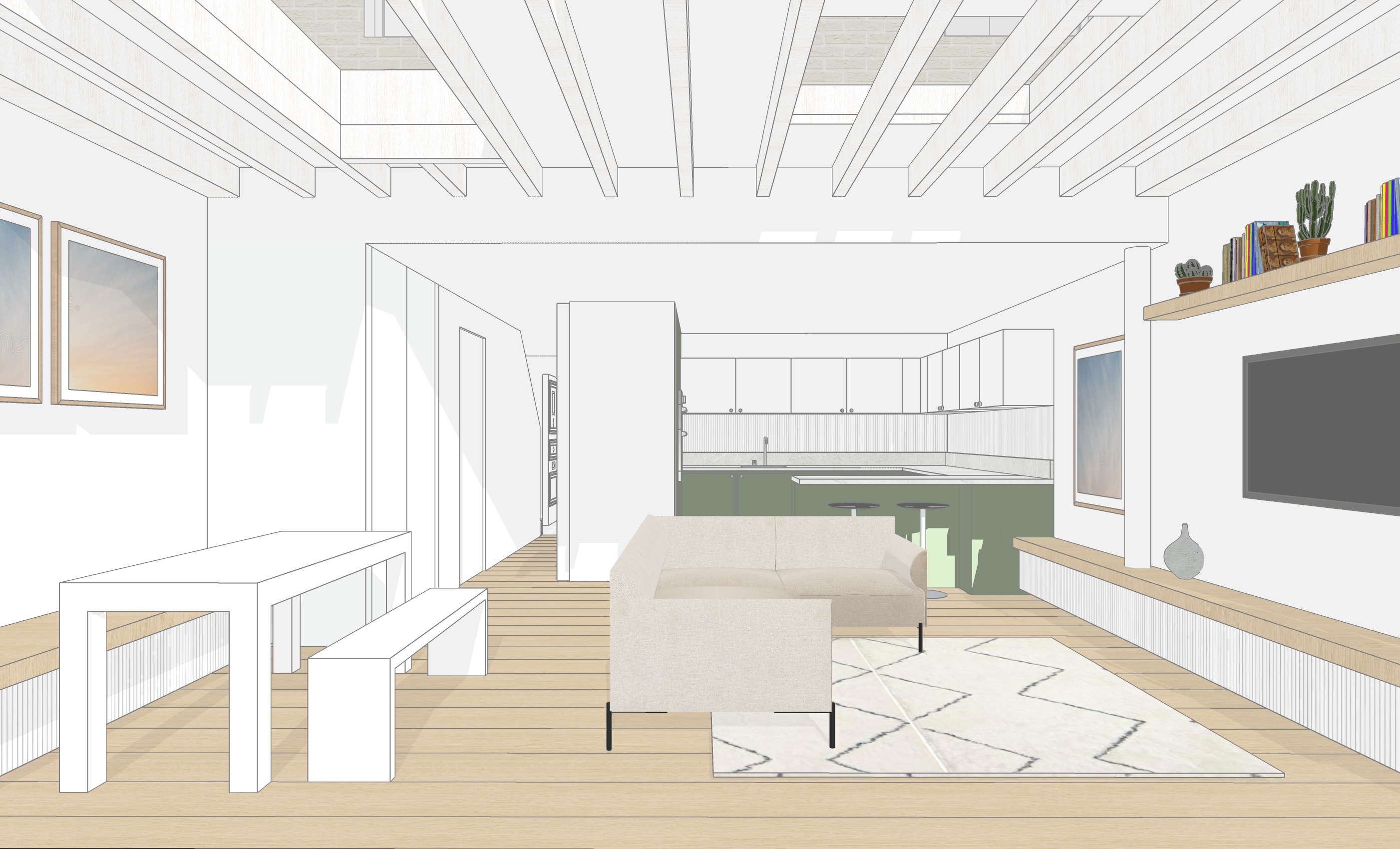 add light and atmosphere its golder hour outside and the light is flooding in creating shadows on the walls and floor make the materials soft and subtle with minimal contrast