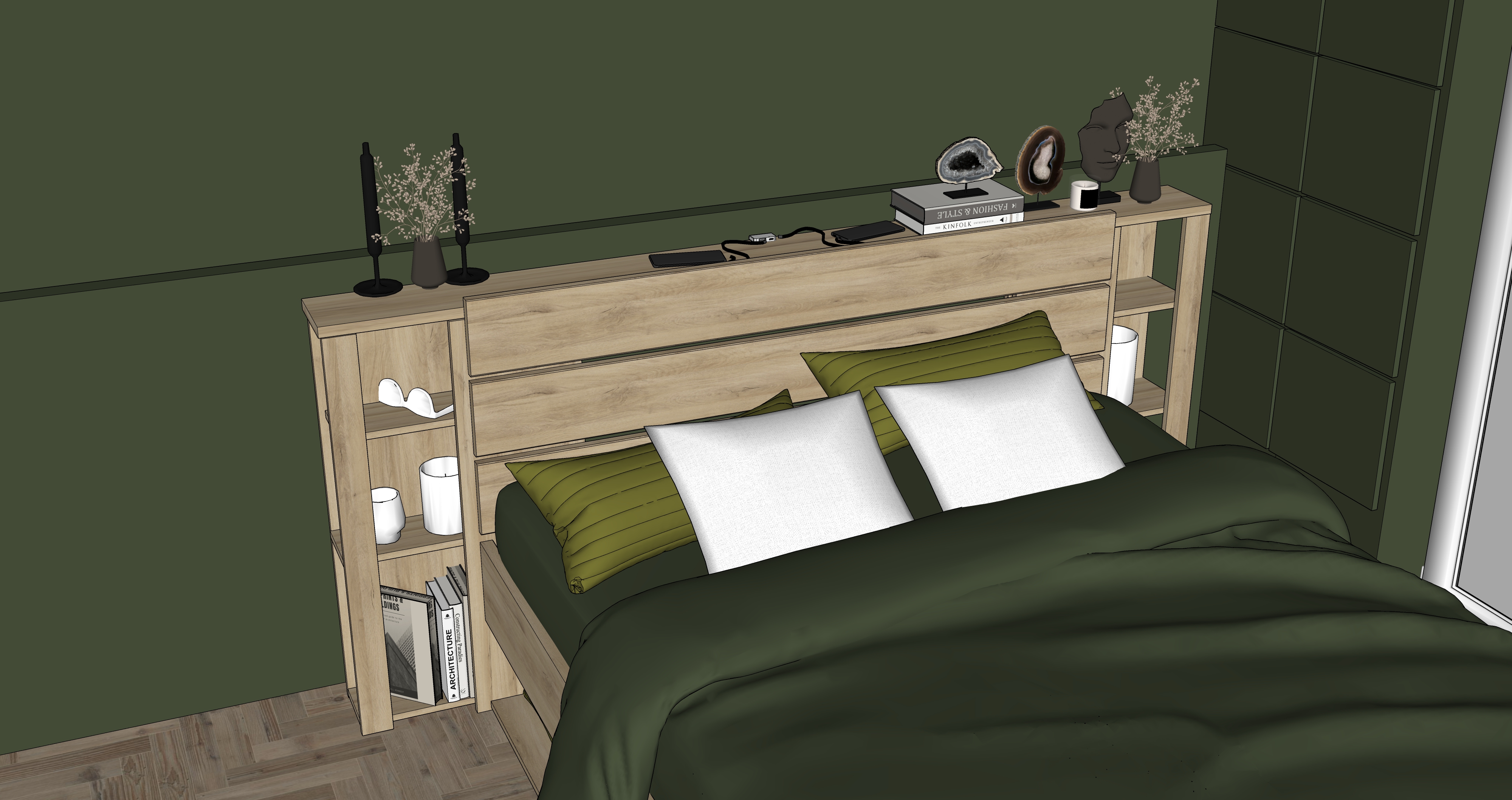 chambre moderne et chaleureuse au design naturel grand lit avec drap beige couvertures vert fonc et coussins assortis mur d coratif vert textur plantes tombantes fix es en hauteur suspensions avec ampoules vintage en verre sol en bois clair grand tapis gris chaussures dans les niches basses du lit ambiance cosy style contemporain et minimaliste clairage doux et r aliste rendu photor aliste haute r solution