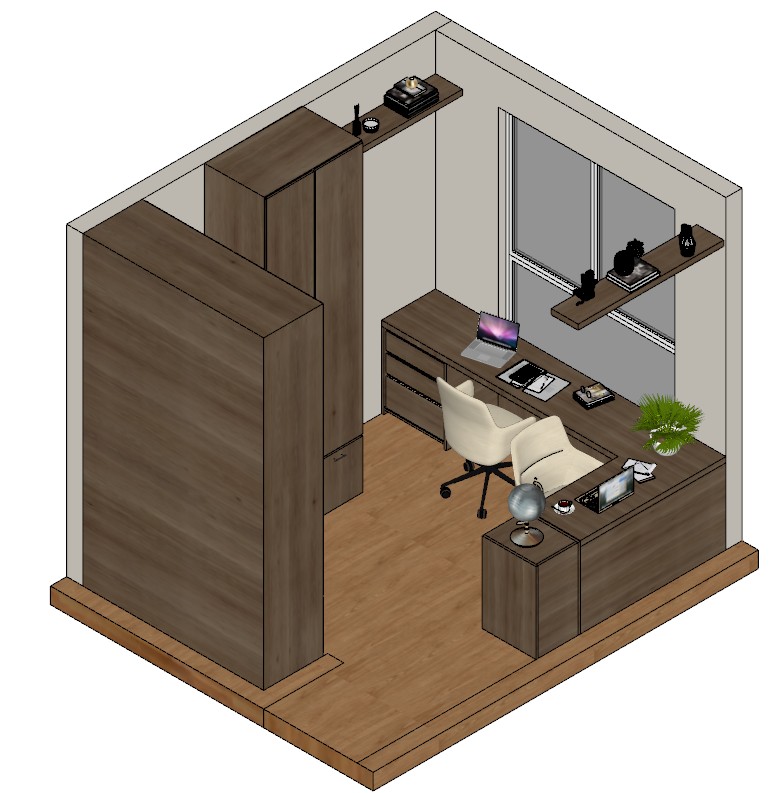 contemporary home office interior axonometric view strictly based on provided 3d model preserve exact geometry proportions and layout without adding removing or modifying any elements maintain original materials textures and colors exactly as shown beige walls light natural wood flooring and medium tone wood furniture do not reinterpret or enhance materials no gloss no extra reflections no surface variation lighting must remain completely neutral and flat with no added artificial lighting no dramatic shadows no ambient glow no led effects and no sunlight simulation use only uniform shadowless lighting as in a raw architectural model display furniture includes a linear wooden desk attached to the wall two upholstered chairs in light fabric upper floating shelves and a tall wooden storage unit keep all objects exactly as modeled including placement and scale window must remain in the same position and size outside the window include a subtle realistic view of a single tree as seen from a third floor apartment soft focus no strong lighting no sky dramatization camera angle axonometric isometric perspective clean and technical no perspective distortion overall style highly realistic but strictly faithful to the original model no artistic reinterpretation no added decor no extra objects no changes in composition