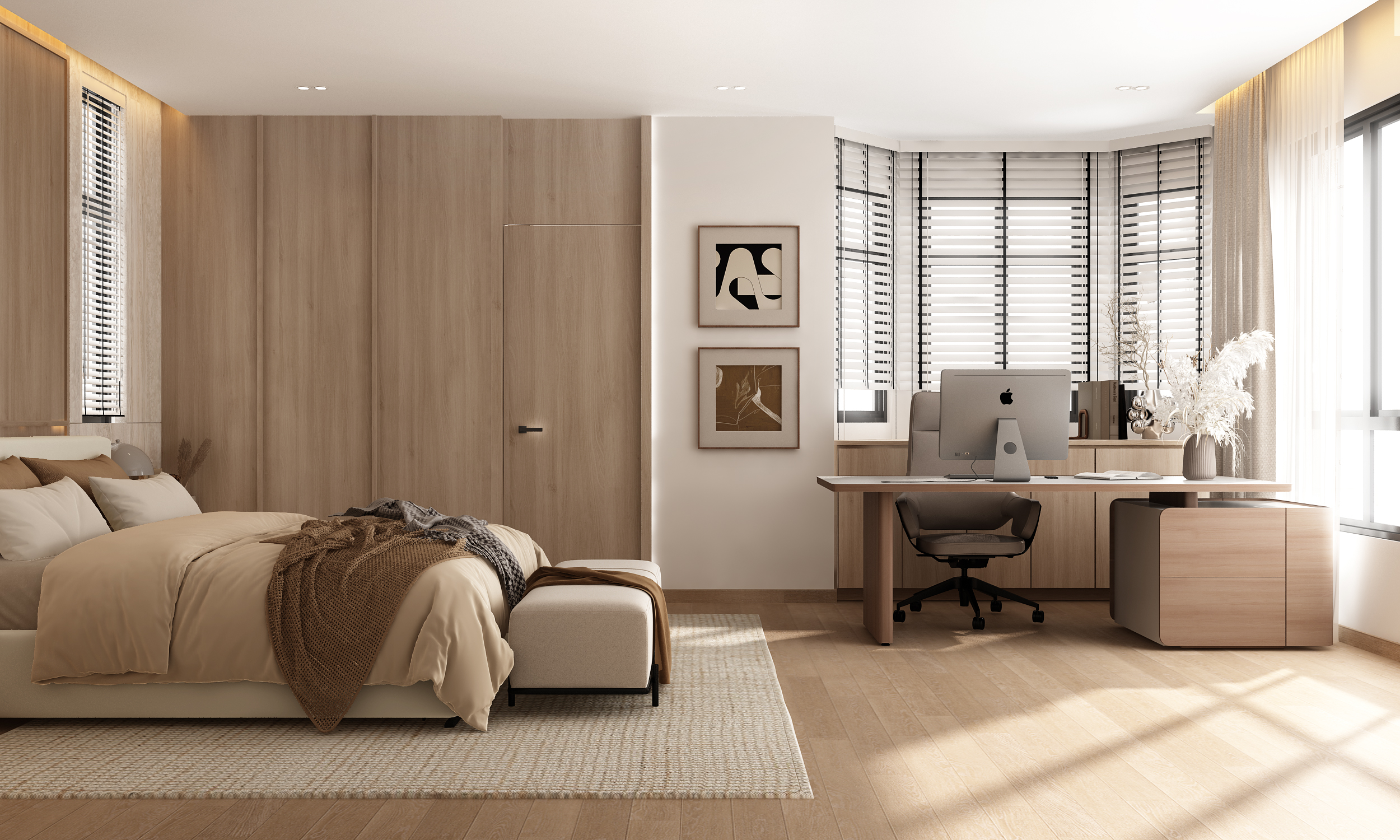 the original image is the authoritative reference follow the drawing exactly preserve all wall positions and room proportions exactly no redesign no change of camera angle no layout modification no change on all geometry realistic materials soft global illumination warm ambient lighting led strip accent lighting sunlight entering from windows realistic shadows ambient occlusion highly detailed furniture clean architectural visualization ultra sharp render minimal background high contrast lighting dramatic shadows ray traced lighting photorealistic rendering ultra detailed textures render in warm natural morning daylight