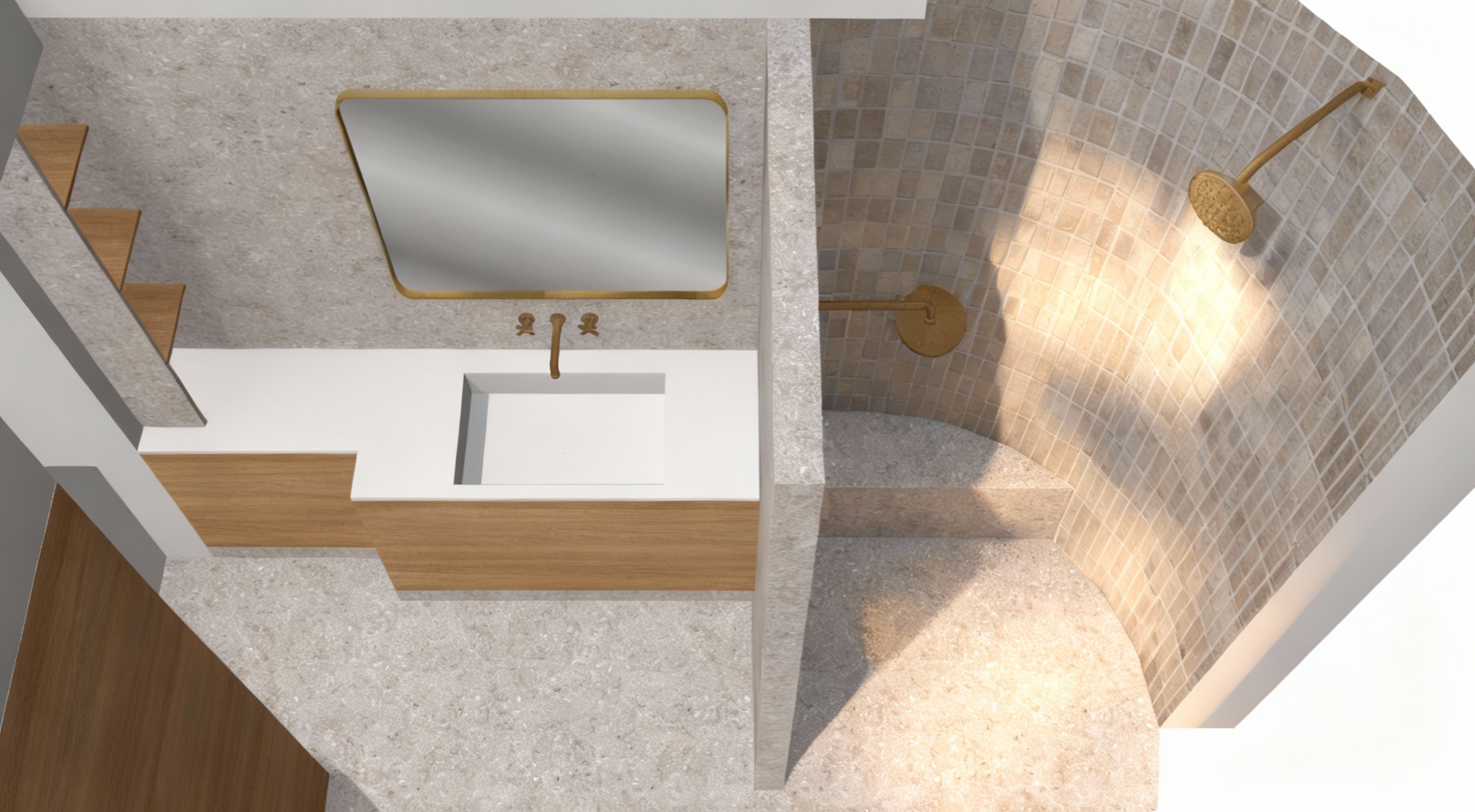 enhance this sketchup render with high realism while strictly preserving the original camera angle perspective proportions layout geometry and spatial relationships of the model keep all objects in their exact positions and maintain the same scale and composition improve materials lighting shadows textures and environmental details to achieve a photorealistic architectural visualization add subtle surface imperfections realistic reflections and natural light behavior do not change or add any new architectural elements unless they are small realism details e g material texture natural light soft shadows maintain the original design intent exactly architecture