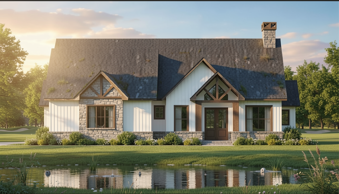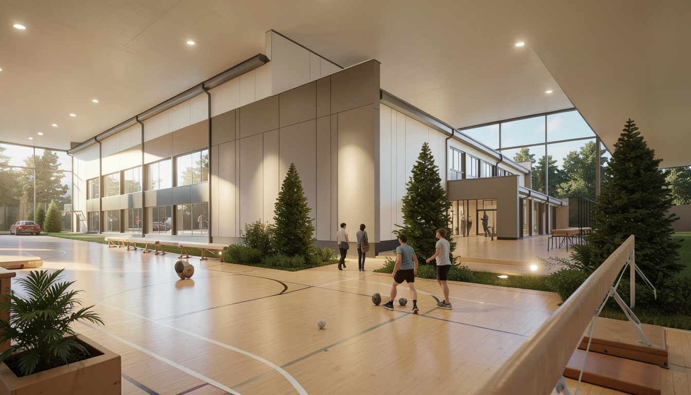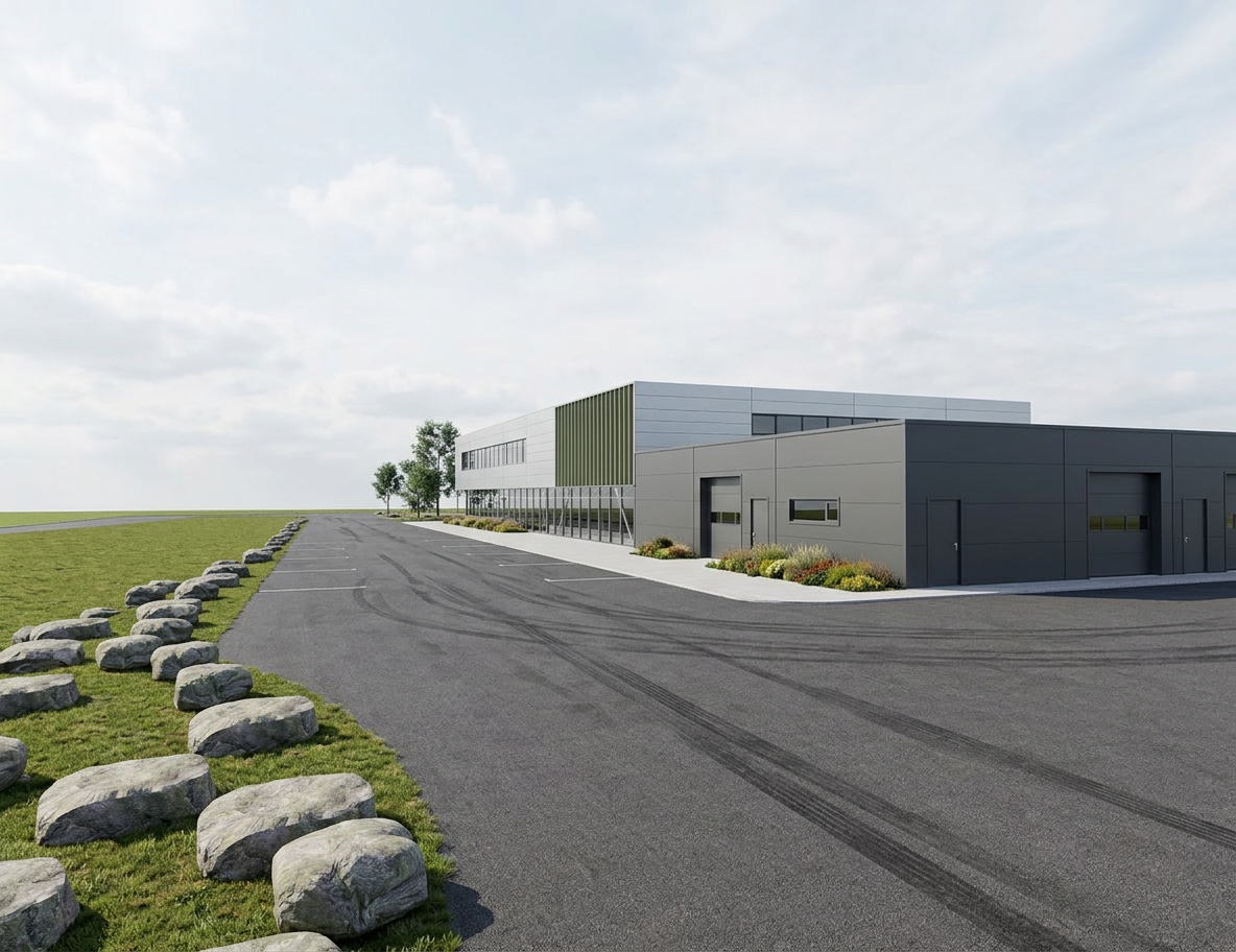 strict geometry preservation maintain all edges outlines building shapes and architectural elements exactly as shown in the input image the architecture must not change in any way do not move remove add or redesign any walls windows doors roof shapes columns or proportions treat the building geometry in the input image as fixed and immutable only improve materials lighting environmental realism and rendering quality render the scene as a highly realistic architectural photograph of a modern industrial office and workshop building the upper floor facade is smooth light grey aluminum metal cladding with subtle horizontal panel joints spaced approximately 1 meter apart across the entire facade all aluminum facade panels must be exactly the same uniform light grey color with no color variation between panels the facade should appear as high quality industrial aluminum cladding with clean precise detailing the building also includes translucent polycarbonate wall sections which must remain clearly visible exactly where they appear in the input image these polycarbonate walls should appear as realistic translucent industrial panels that softly diffuse light while still revealing subtle structural elements behind them the ground floor facade consists of large aluminum framed curtain wall glazing revealing the interior steel structure the exposed diagonal structural columns supporting the upper floor are dark grey raw structural steel maintain the long horizontal ribbon windows on the upper floor exactly as shown preserve the vertical green metal cladding section on the corner of the building exactly as in the input image the adjacent workshop volume has smooth dark grey industrial facade panels with large sectional garage doors and service doors the surrounding site contains dark asphalt pavement with subtle tire marks and realistic parking lines where appropriate concrete sidewalks run along the building facade the landscape includes grass areas and natural stones along the roadside with minimal vegetation lighting should be soft natural daylight with slightly cloudy nordic sky conditions producing realistic shadows and reflections in the glass facade materials should appear highly realistic including uniform aluminum facade panels translucent polycarbonate wall panels exposed structural steel columns reflective curtain wall glazing asphalt pavement and natural vegetation the final image should look like a high end architectural photograph or professional architectural visualization photorealistic clean modern and realistic while keeping the building geometry perfectly identical to the input image