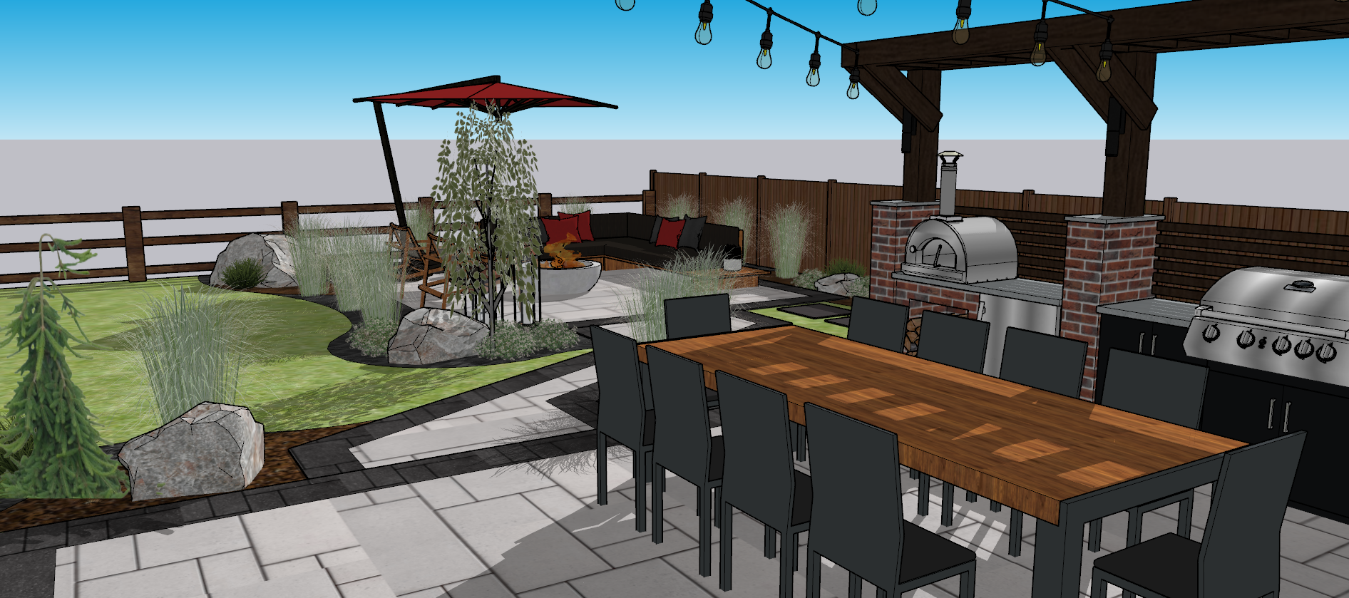 this is a back patio area make it dusk and add houses to the background make the houses in the background older brick homes