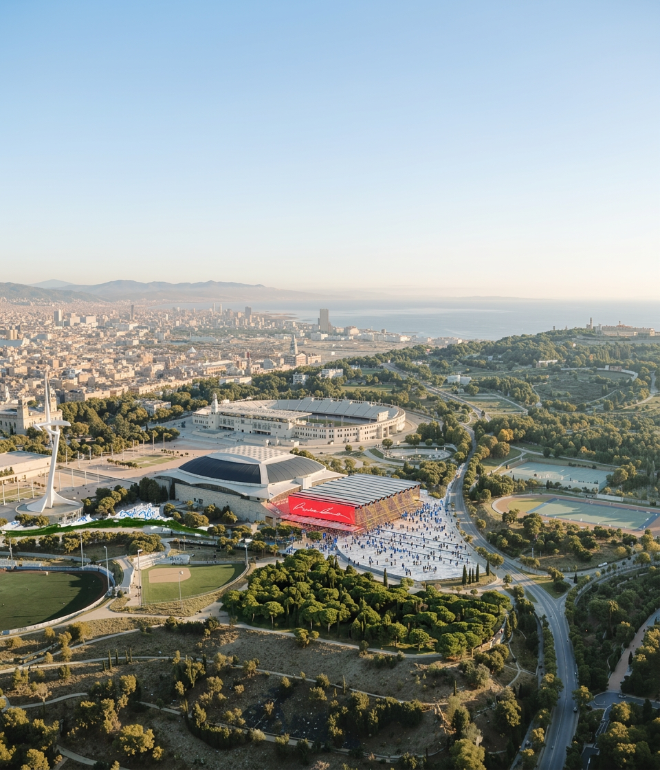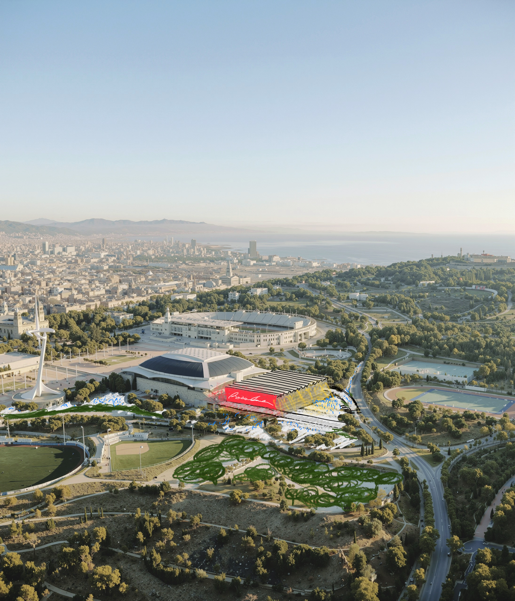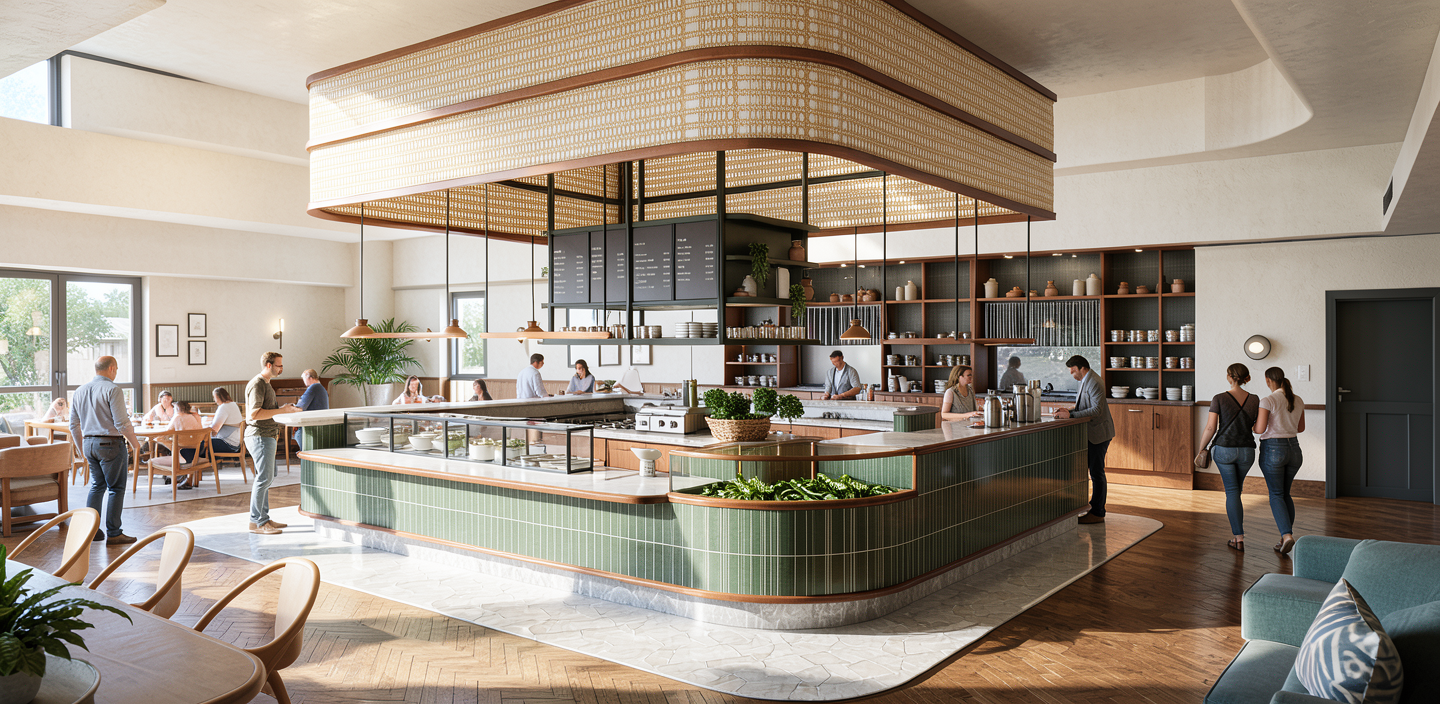 the white platform is a pavement like granite the blue dots are people the green are trees the roof is corrugated with a large section make it realistic