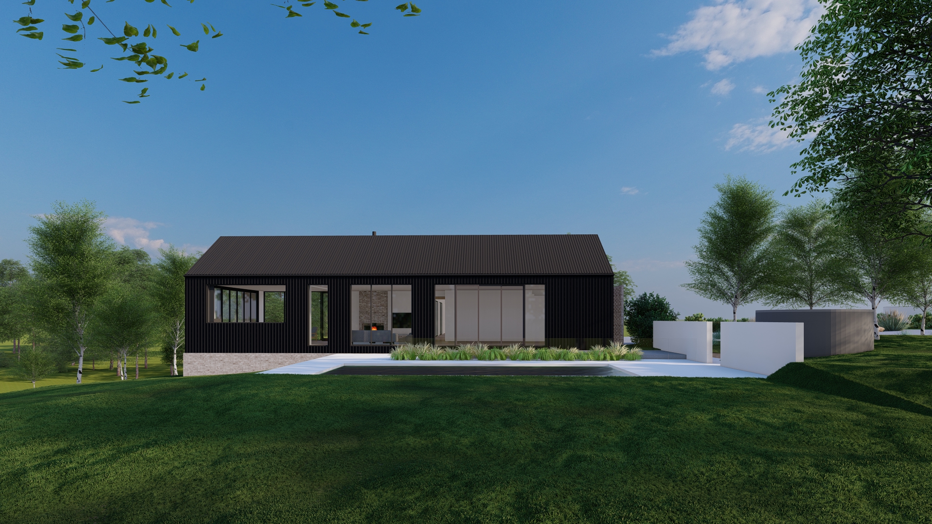 photorealistic architectural rendering of a contemporary australian rural home enhancing an existing lumion base image introduce soft atmospheric depth abundant natural light with a warm low angle sun early morning or late afternoon creating gentle highlights and soft shadows the front of the building needs direct sunlight on an oblique angle refine materiality to feel tactile and true to life timber with visible grain and tonal variation stone with natural irregularity and depth metal with subtle reflectivity and imperfections glazing with realistic reflections and slight interior transparency add understated warm interior lighting 2700k 3000k to create a soft glow ensuring it feels natural and not overexposed balance interior and exterior lighting so neither dominates enhance landscaping with slight movement and realism softened edges and subtle tonal variation in grasses and foliage introduce light environmental effects e g faint haze diffused background to increase depth and atmosphere overall mood should be warm calm and evocative slightly ethereal but grounded in realism avoid overly dramatic contrast or stylisation aim for a premium architectural photography aesthetic with a cinematic softness walling and roofing to be matte black corrugated iron