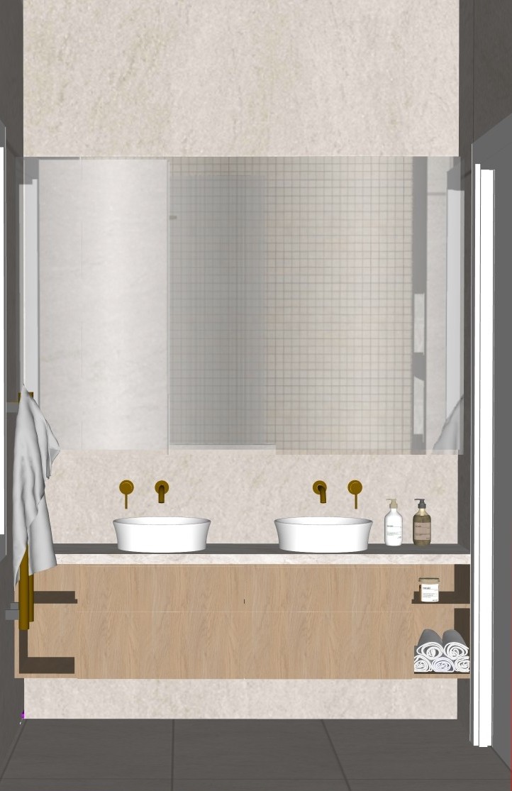 transform this sketchup interior render into a hyper realistic interior photograph preserve room layout scale and camera position exactly replace materials with physically accurate pbr surfaces showing subtle wear natural texture variation and realistic light response use physically correct interior lighting with believable exposure soft shadows bounced light and accurate colour temperature the reflection in the mirror is shown