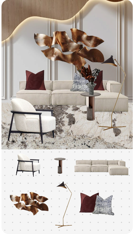 create a modern living room with a luxurious atmosphere central to the scene is a beige sectional sofa adorned with deep burgundy throw pillows a sophisticated white armchair sits nearby accented with a black frame the floor is covered with an elegant marble patterned rug featuring shades of white grey and brown a stylish side table with a dark brown base and black top holds a modern floral arrangement a sleek floor lamp with a brass stand and black shade arches gracefully over the space behind the sofa a captivating abstract wall sculpture in metallic copper adds artistic flair the walls are paneled with light beige creating a warm and inviting ambiance soft curved lighting highlights the room accentuating a cozy yet chic atmosphere