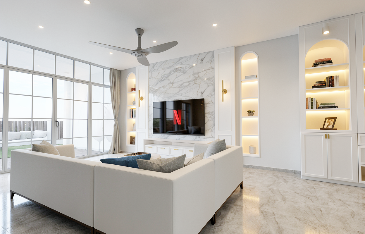 glossier floor decorated solid white bookshelf no need decorations for the rest add led lights inside the cabinets of bookshelf do not change the color of original feature wall 2 boards under the wall lamp is grey please do not add decorations to windows