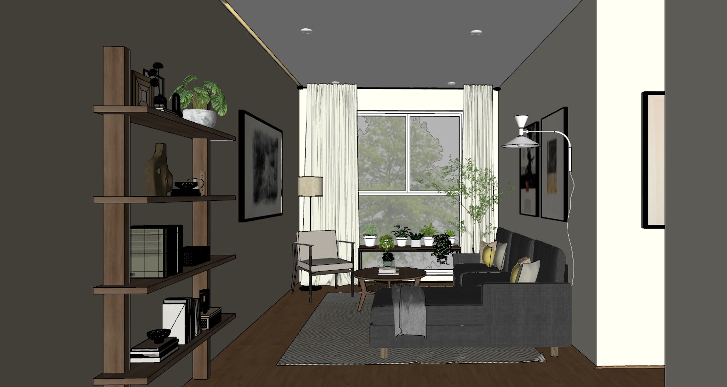 photorealistic interior render of a small contemporary living room strictly preserving the original architectural model proportions layout and furniture placement the scene features an l shaped sofa upholstered in oxford gray fabric with neutral cushions a modern armchair and a round coffee table the floor is ash tone natural wood with realistic grainwall color distribution is clearly defined the left wall is warm brown the back wall slightly lighter warm brown the right wall is soft light beigea large window with sheer white curtains diffuses soft daylightthere is a recessed ceiling detail with a single warm led strip 3000k only on the upper left side of the ceilingstrict rule no led strip on the right side no secondary strip no symmetry the right ceiling edge must be completely clean with no light linesrecessed ceiling spotlights are on with low intensity warm light soft subtle illuminationglobal lighting is soft dim and balanced no overexposurecritical wall constraint the right wall must remain visually flat and evenly lit with no bright spots no light patches no reflections no hotspots no gradients caused by artificial lightingno light spill no indirect glow no bounced light hitting the right wall from lamps or ceiling the right wall must appear calm matte and uniformabsolute restriction no lighting inside furnitureno power outlets no sockets no added artifactsno circular bases no floor discs no extra objectsleft side white floor lamp is on with soft warm lightright wall mounted lamp is completely white and on but with very subtle emission that does not create visible light patches on the walllighting remains asymmetrical dominated by the left ceiling leddecor includes plants wall art and rughigh quality pbr materialscamera eye level 35mmultra photorealistic render global illumination ray tracing soft shadows no stylizationavoid rendering artifacts avoid light leaks avoid wall reflections enforce clean uniform surfaces