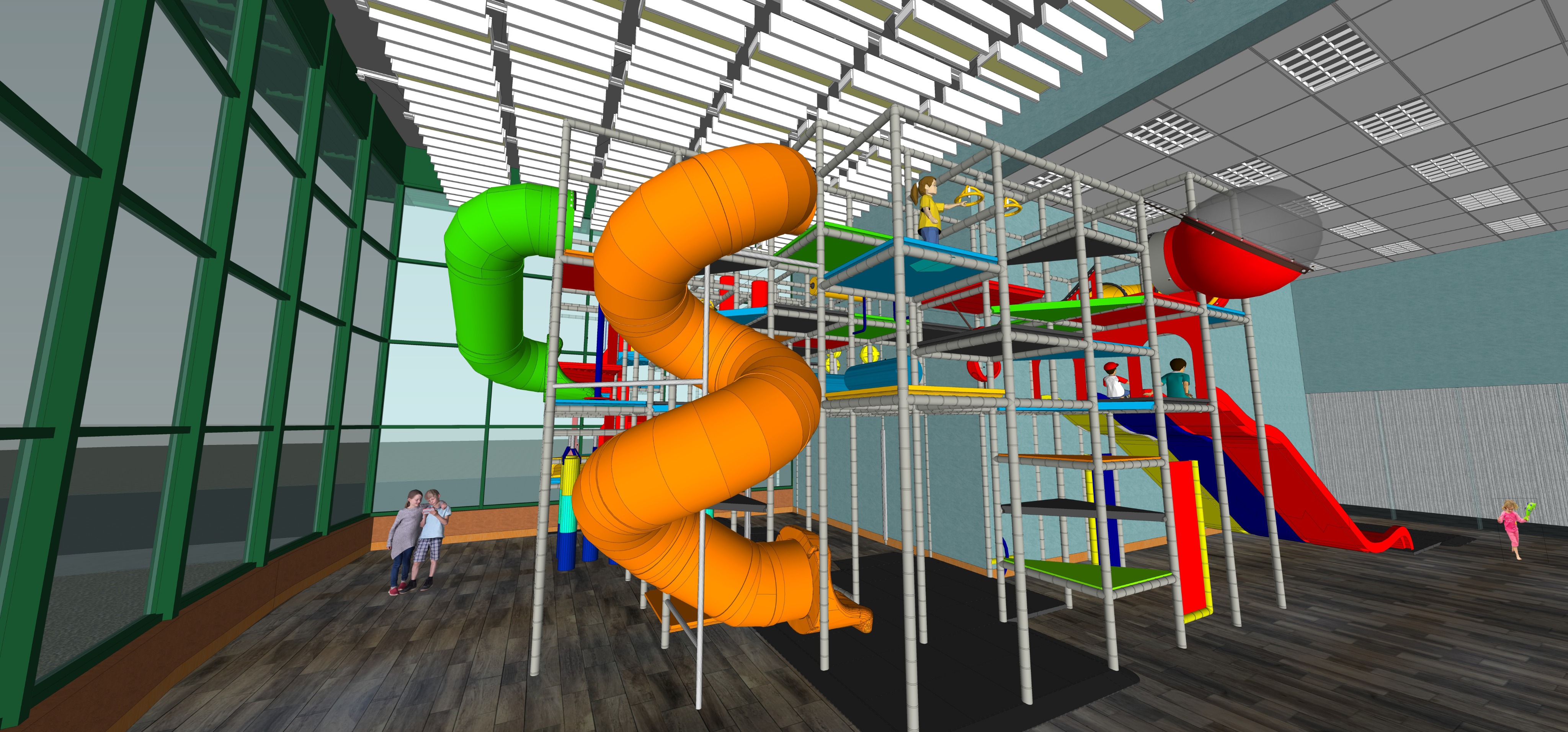 well lit room lights shown in ceiling grid and between sound baffles kids playing on and around playground parking lot outside to left road straight ahead lit hallway through windows on right