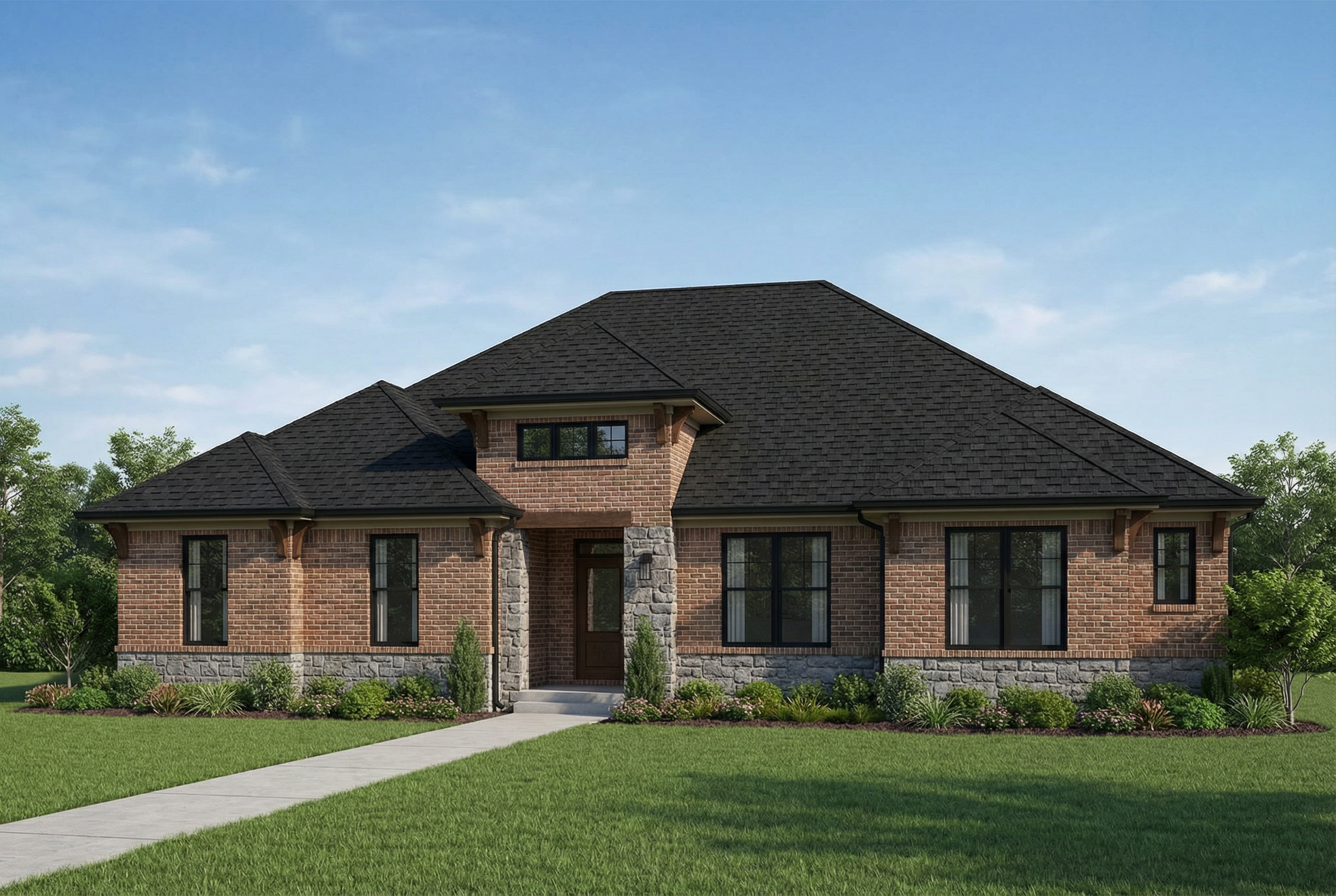 create a beautifully rendered architectural floor plan in a modern style use a soothing color palette with light blues for the walls soft greys for the floors and warm oak wood accents for the furniture highlight pathways with a gentle cream hue incorporate lush green for indoor plants to add a touch of nature the atmosphere should be serene and inviting with soft natural lighting streaming through large windows casting subtle shadows for depth and dimension