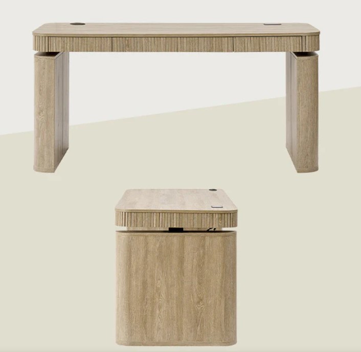 create a clean to scale 3d model of a modern electric height adjustable desk based exactly on this reference image the desk should be 60 inches wide 26 75 inches deep and use an electric lift frame with a height range from 29 to 47 25 inches model the rectangular desktop with softened corners and a warm wood finish and maintain the horizontal slatted detailing on the front and sides of the base cabinet under the top add three centered soft closing drawers in a horizontal row with minimal modern drawer fronts on both left and right sides include full height storage cabinets that support the desk each with a flat push to open door and one interior shelf keep the built in cable management area at the back tidy and low profile and represent the small control panel on the front edge for height presets use simple low gloss wood materials for the body and matte metal accents for any structural leg or frame components preserve clean modern proportions and make the model suitable for use in an architectural sketchup scene without changing the basic design