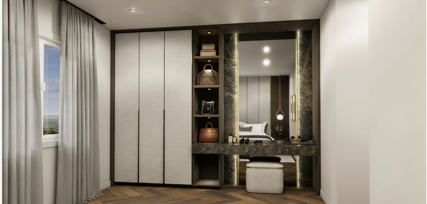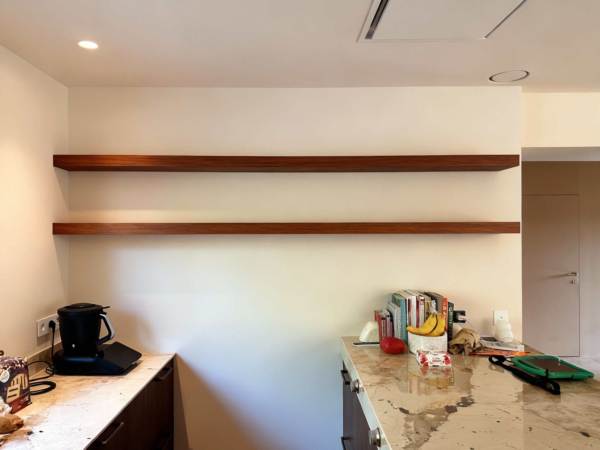 add two walnut shelves on the back wall the shelves are all the width of the wall the shelves are positioned halfway up the wall add some books and tea cups on the shelves more light add big cook books and fruits on the shelves