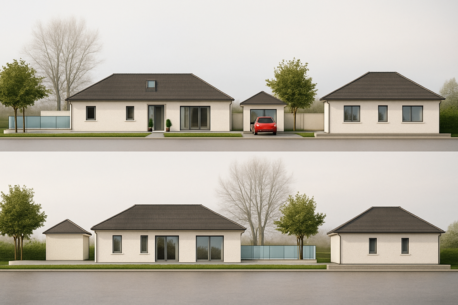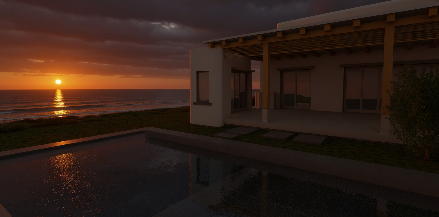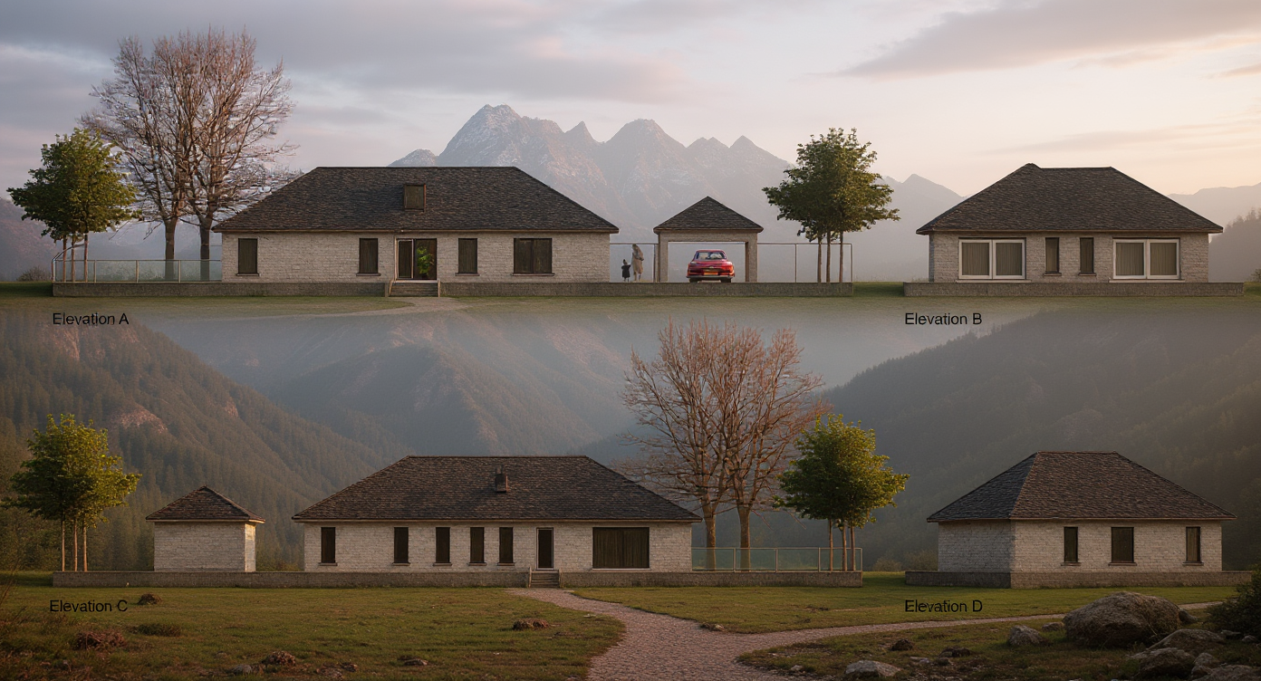 modernist exterior shot modern cottage aesthetic front elevation with wood and stone usage and maybe metal roof in some places like the porch and over windows architecture