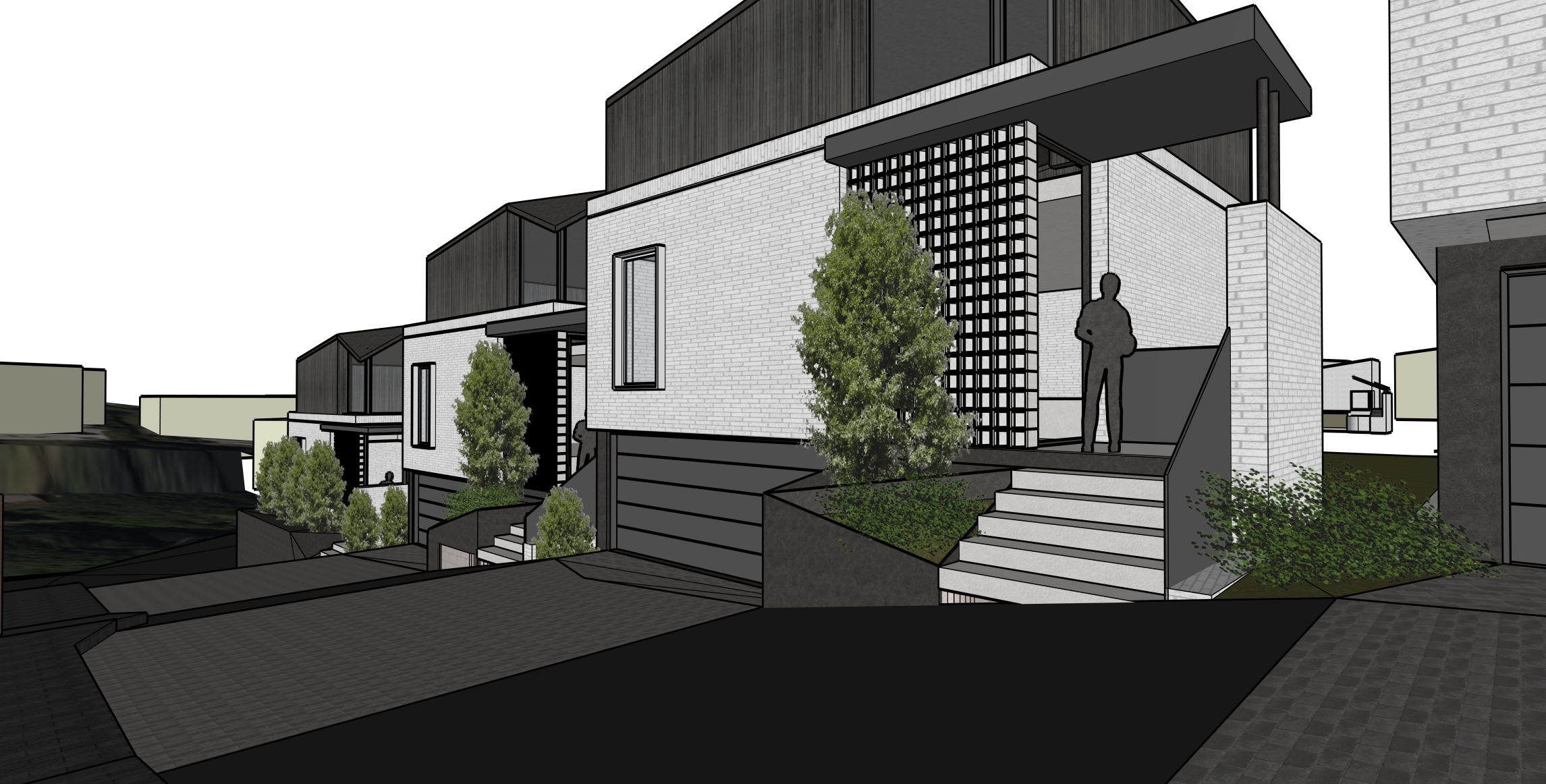modern architectural rendering of a contemporary building with sleek minimalist design the exterior features white brick walls and dark gray accents for a sophisticated look the pathway and driveway are paved with charcoal gray cobblestones creating an elegant approach lush green shrubs and trees line the entrance adding vibrancy and life to the atmosphere the overall ambiance is serene and upscale with a clear blue sky and soft lighting to highlight the structure s details architecture