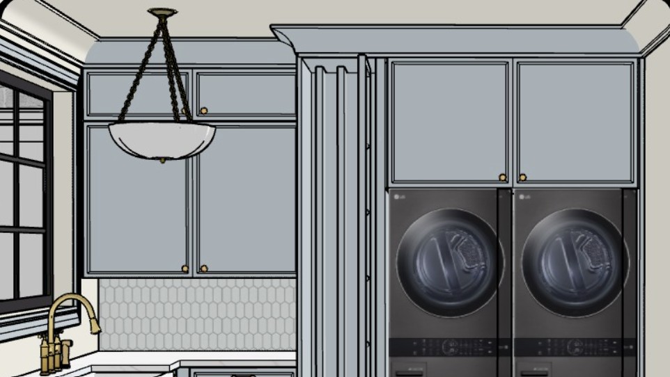 render a cozy and elegant laundry room featuring light gray cabinets with a soft matte finish and subtle gold handles the countertop is pristine white accented by a light beige hexagonal tile backsplash the pendant light overhead is a sleek black and white design casting a warm glow the washing machines are sleek dark gray with a modern metallic finish windows and trims are black adding contrast the room s atmosphere is welcoming and sophisticated with natural light filtering in creating a bright airy feel make the trim around the window the same color as the cabinets make the chain on the light gold