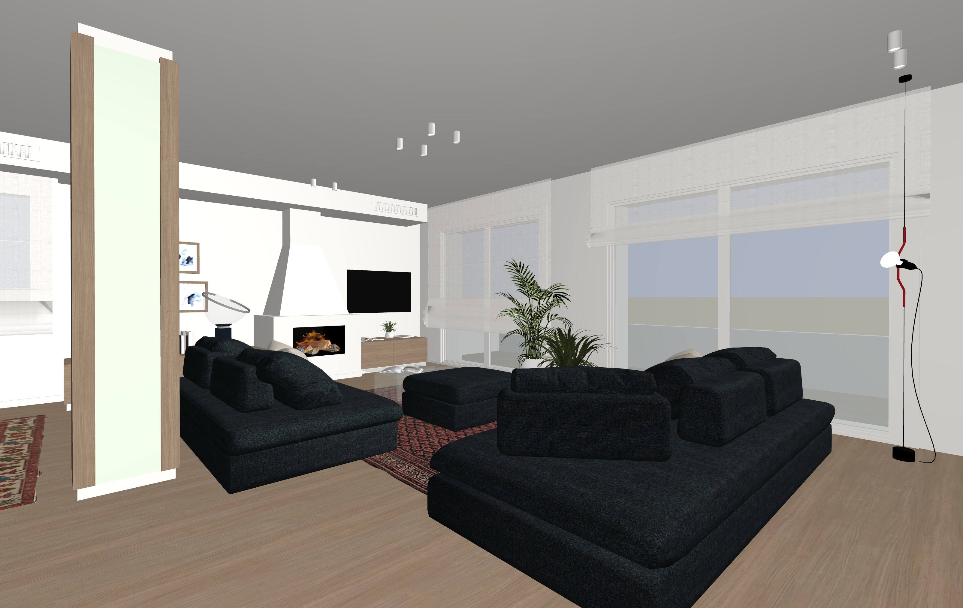 accendi il camino e accendi i faretti bianchi a soffitto non ci sono strip led che illuminano la stanza le pareti e il soffitto sono tinteggiate in bianco caldo a terra abbiamo un parquet in rovere naturale sulla colonna c uno specchio a destra del camino c una tv accendila e metti un film fai entrare della luce naturale dalle finestre le finestre hanno delle tende a pacchetto in tessuto bianco